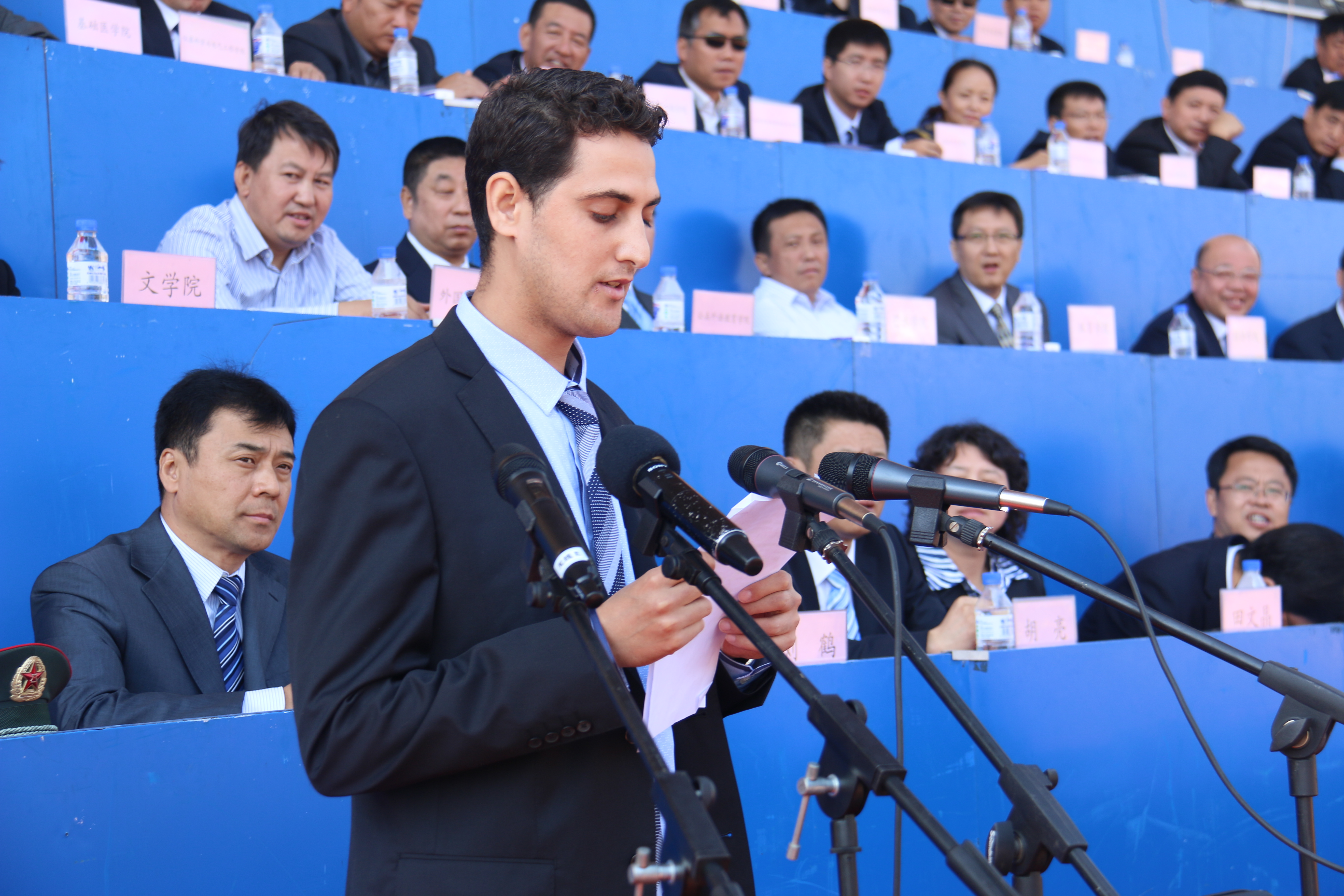 2014级国际关系专业硕士研究生摩洛哥籍的吉米代表全校留学生发言。他在发言中表达了对中国文化的热爱和对未来学习生活的憧憬。他在最后高喊“我爱中国、我爱香蕉视频