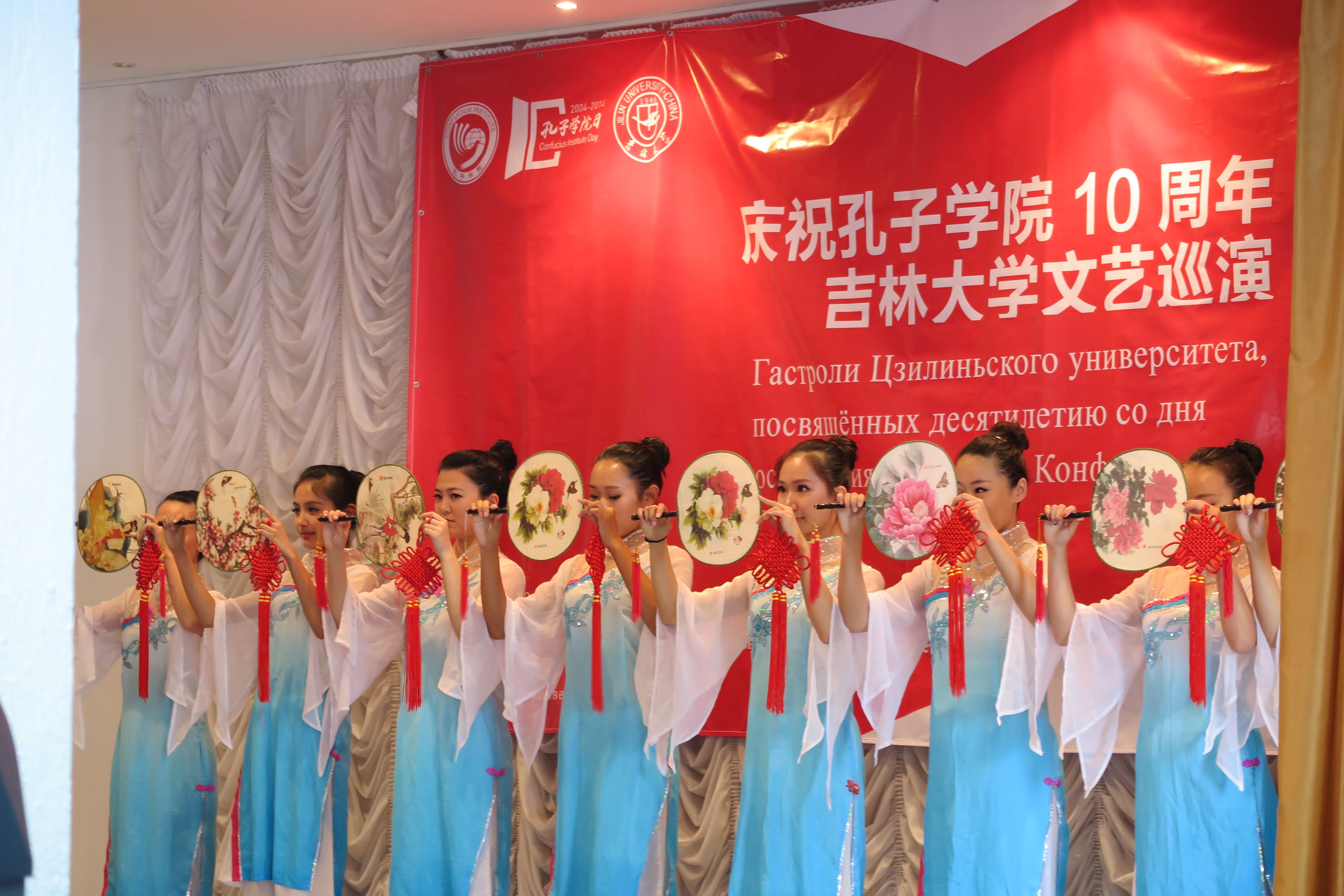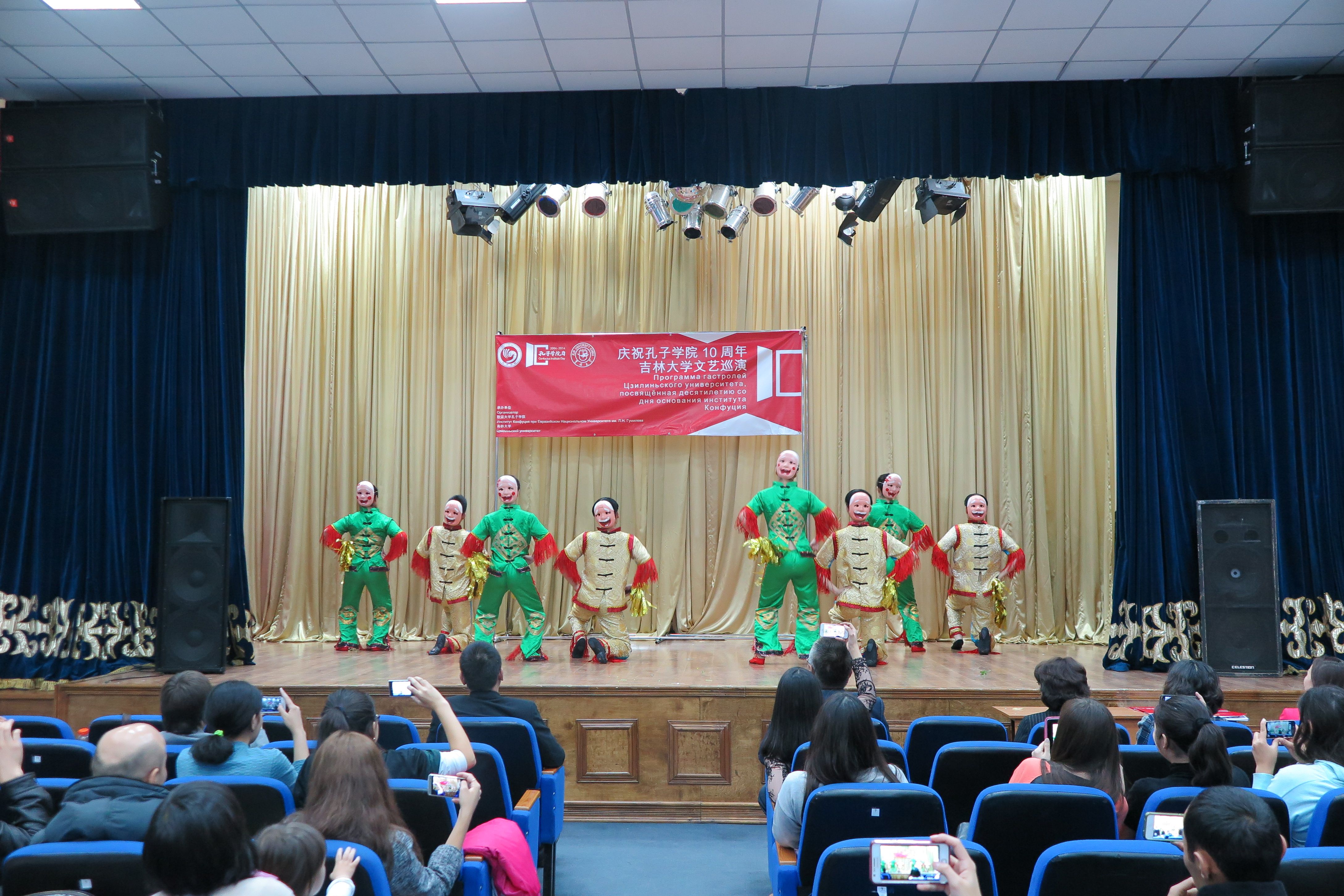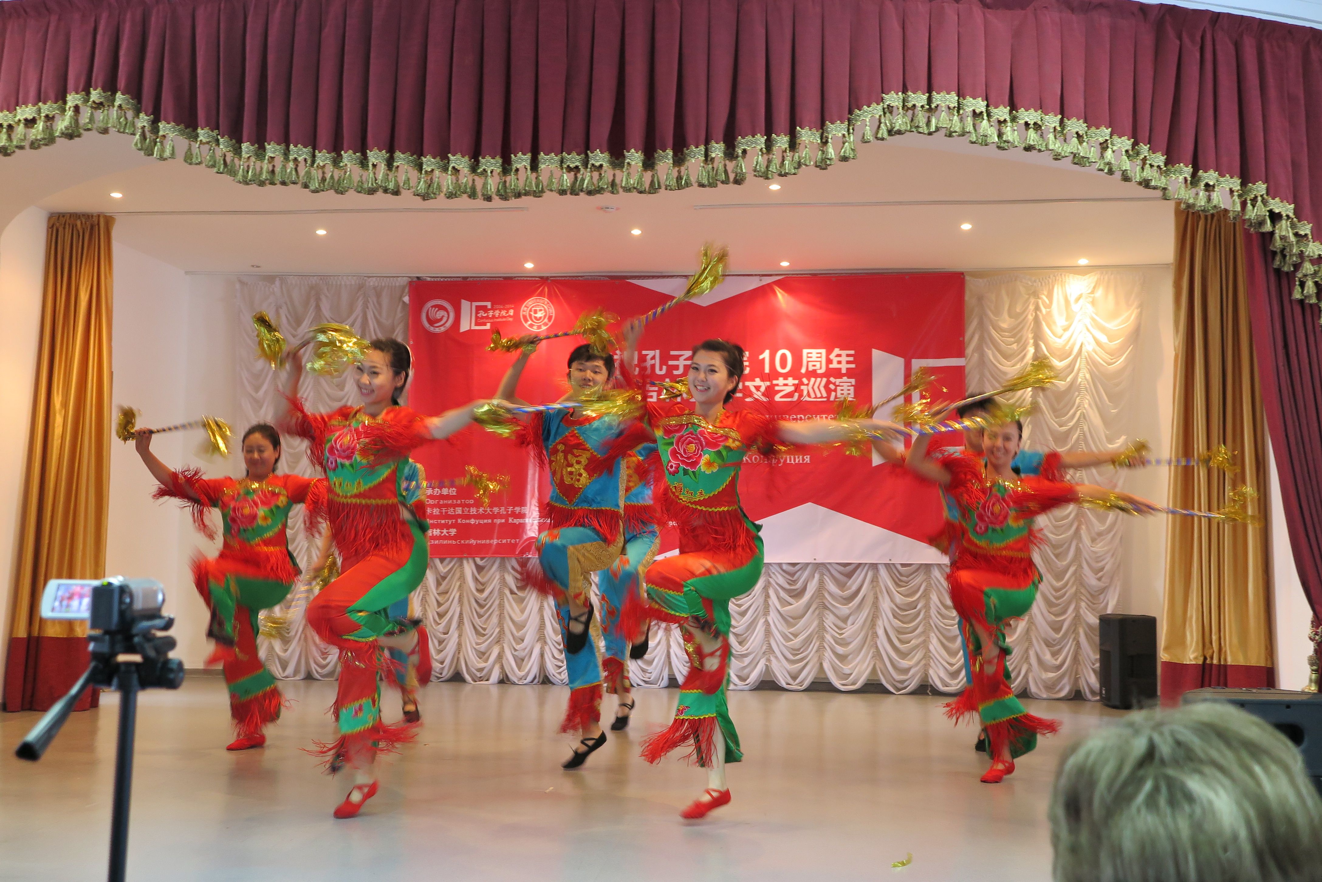 进行演出。演出在新民族音乐《茉莉花》中拉开了序幕,中国传统乐器弹拨出的优美的旋律展现了中华民族音乐的独特韵味。秧歌舞《东北印象》动作明快,节奏欢乐,地域特色鲜明,展现了东北人民乐观开朗的民风,赢得了观众的阵阵掌声。游戏节目更是笑声连连,观众积极踊跃互动。演出取得圆满成功。中国驻哈萨克斯坦大使馆柳燕老师出席并观看了首场演出,并在演出后与演员们合影留念。