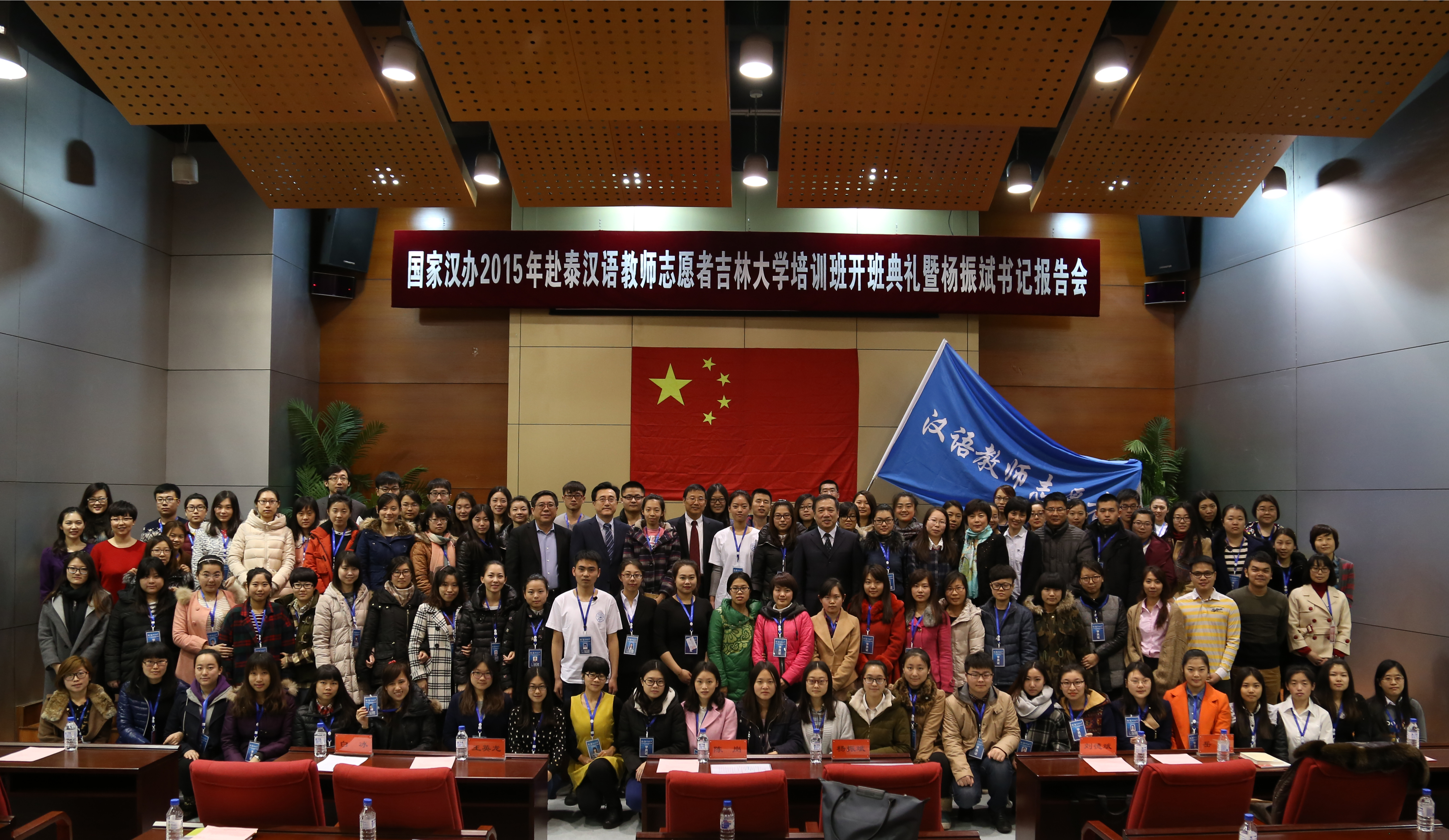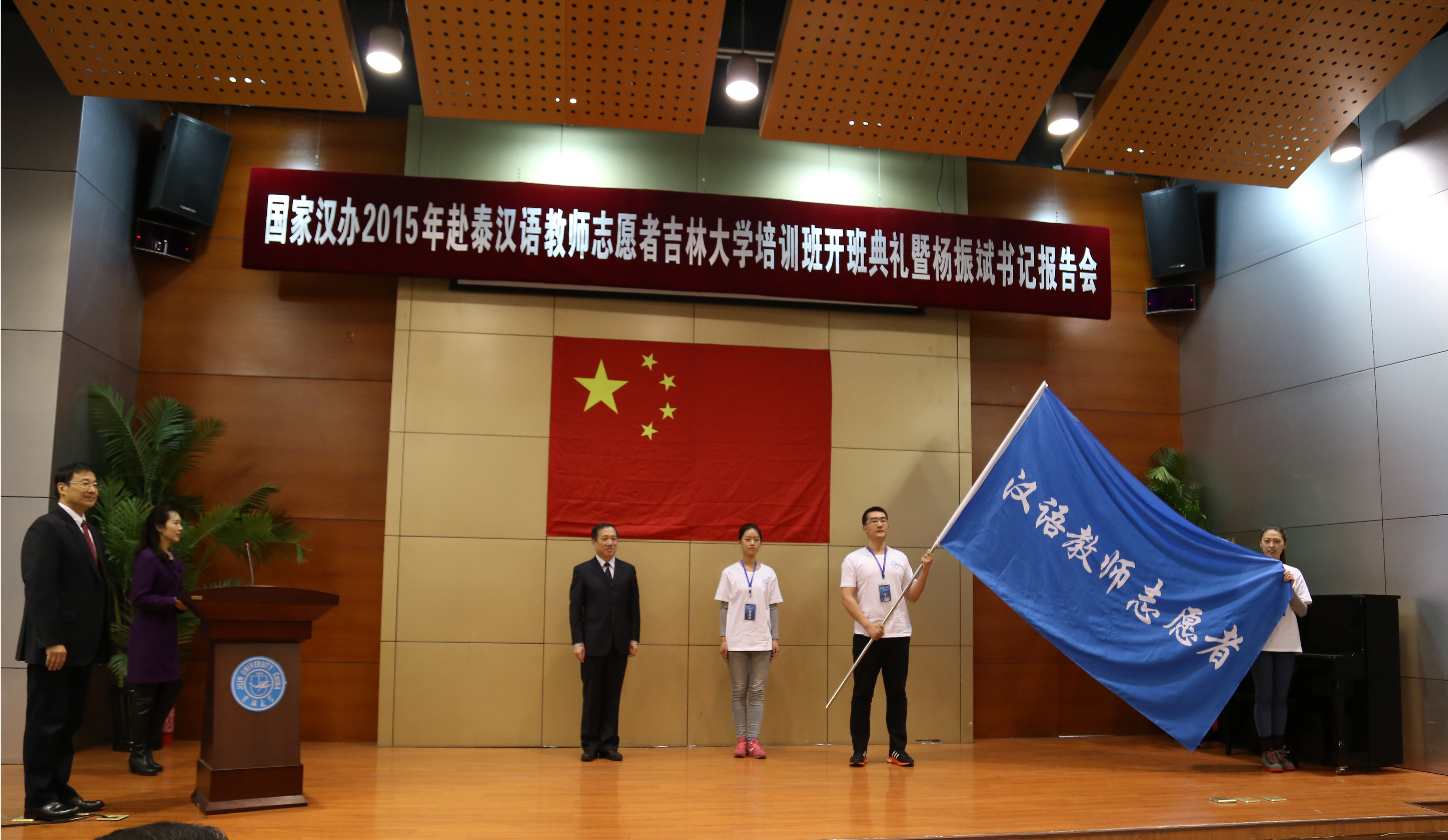 在悠扬的乐曲声中,杨振斌为学员代表授旗。全体培训学员集体宣誓,用铿锵有力的誓词抒发了自己作为汉语教师志愿者的光荣感、使命感与责任感。