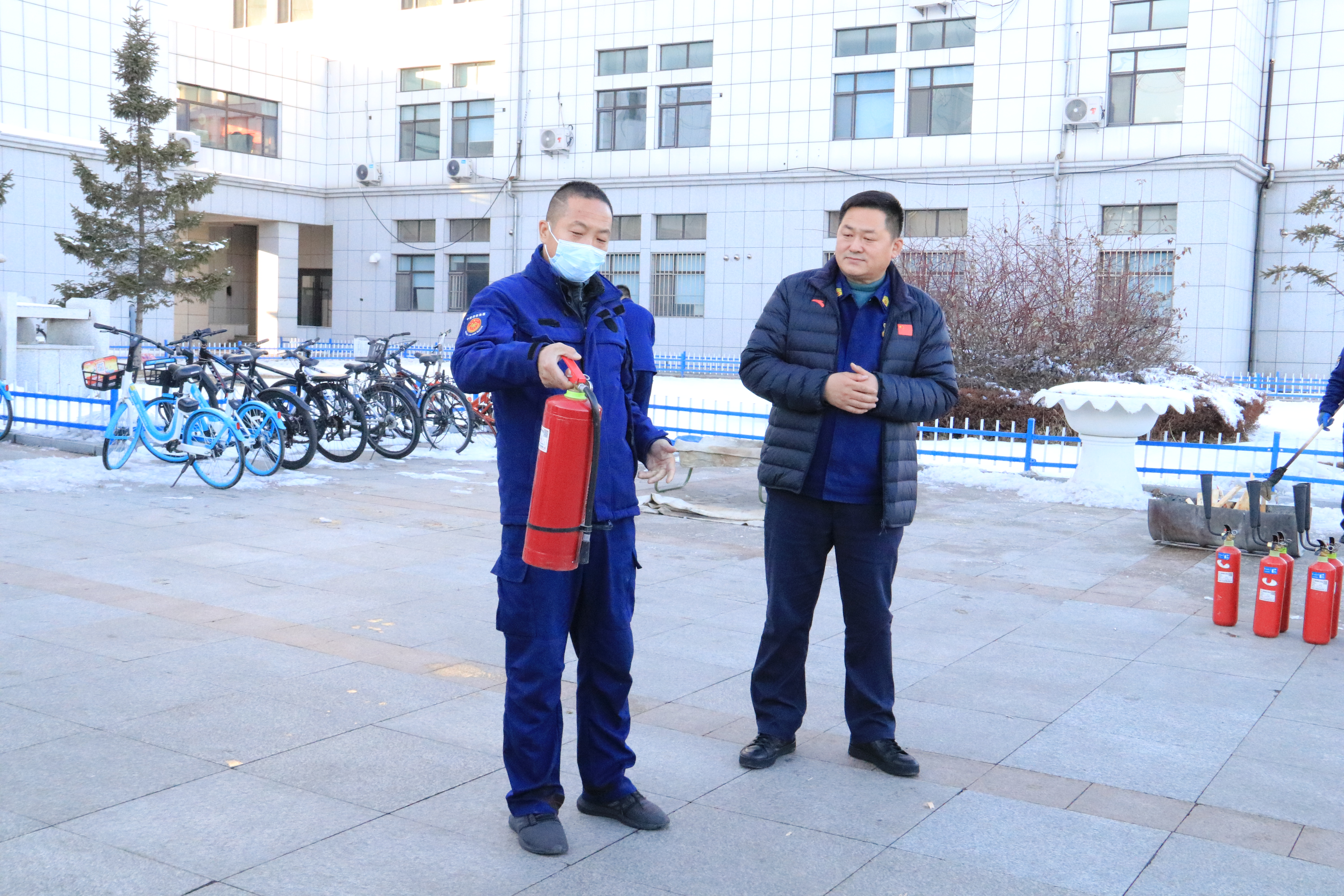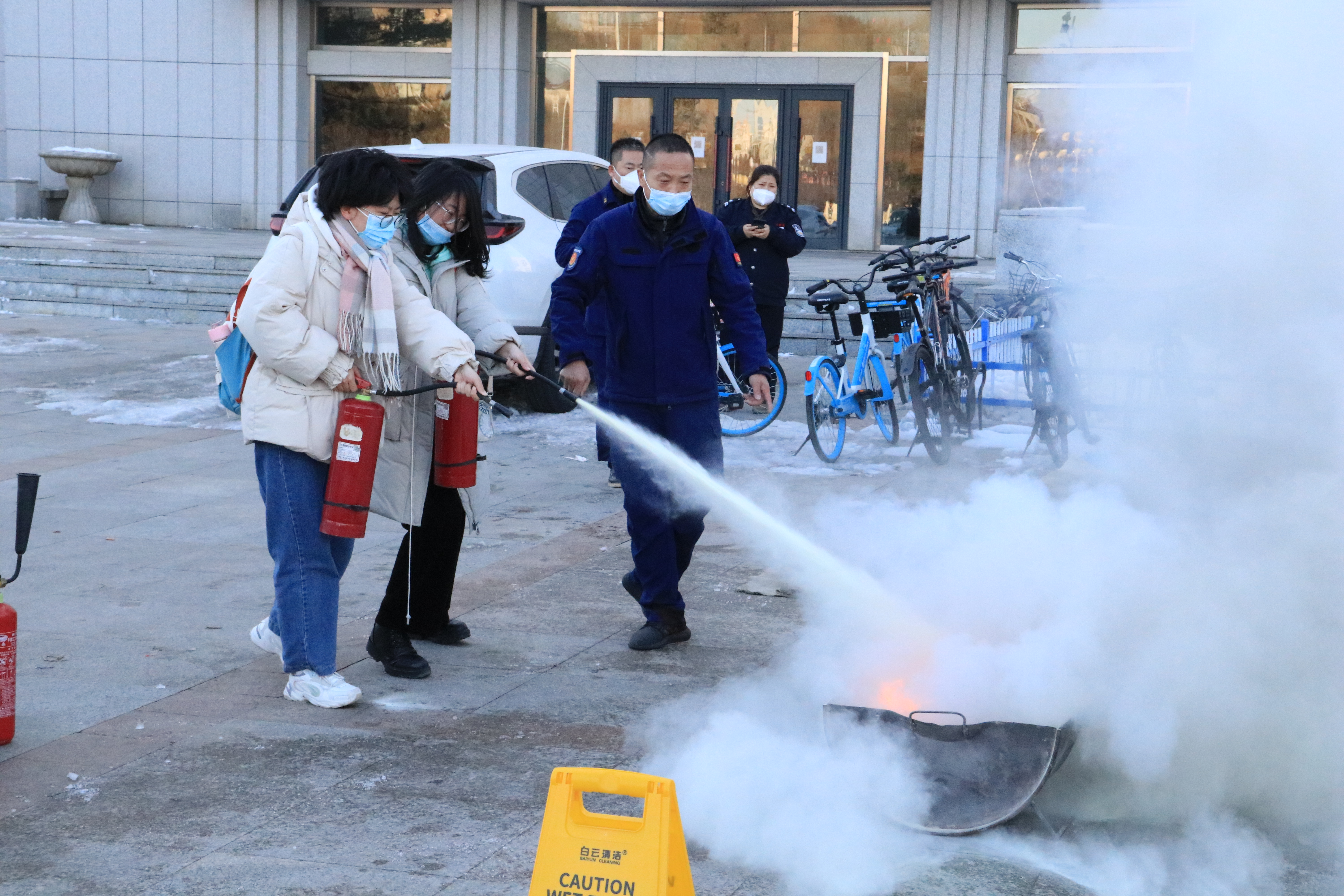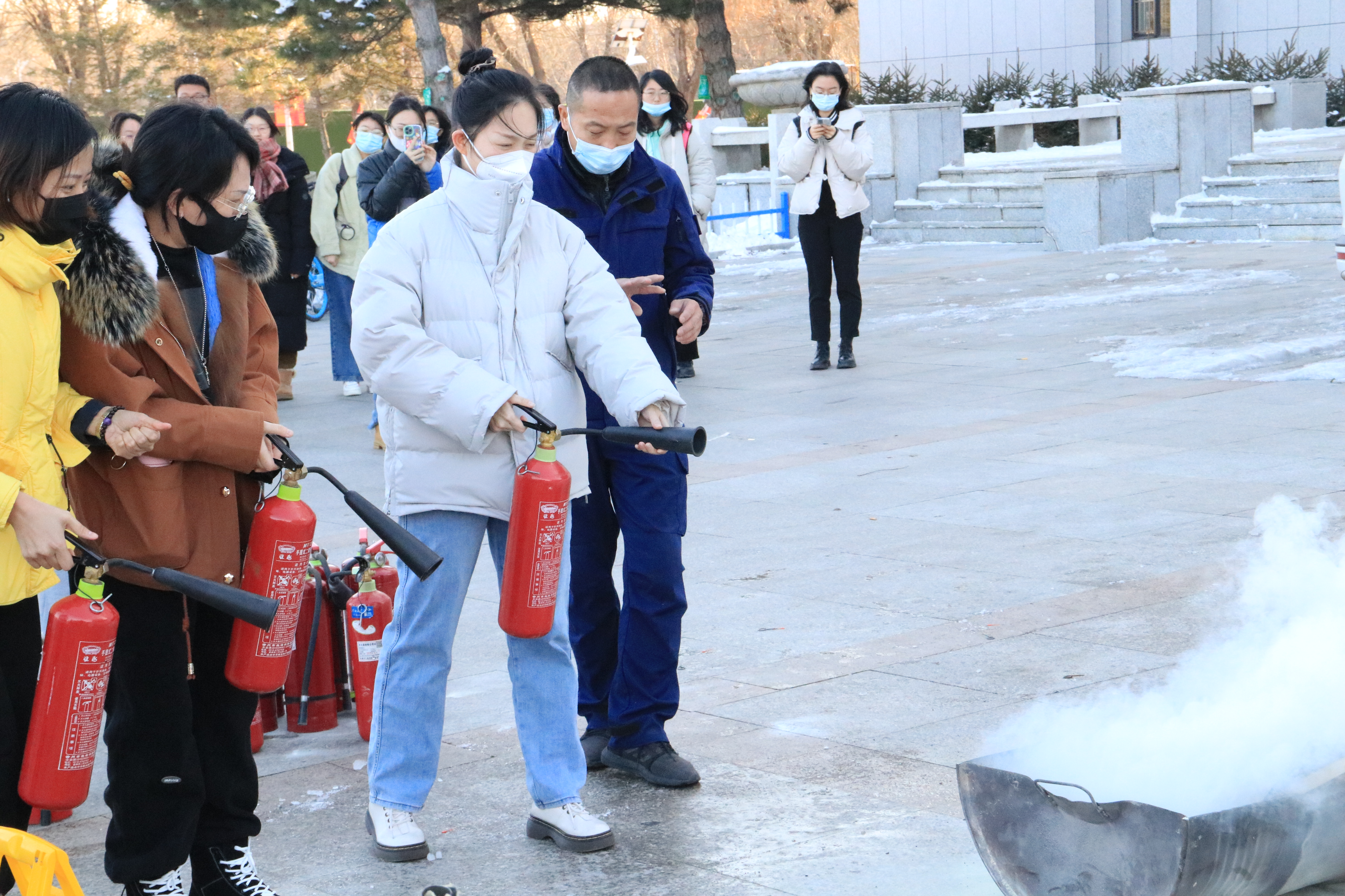 随后,在保卫处消防科消防演练团队的精心准备下,同学们参加了消防安全演练。在吕振羽楼前,工作人员就灭火器和灭火毯的使用及操作中应注意的问题做了详细的说明演示,并现场指导部分师生进行灭火实操演练。演练中,师生们态度认真、密切配合,在实操中增长了消防安全知识,掌握了自救能力,演练达到预期效果。