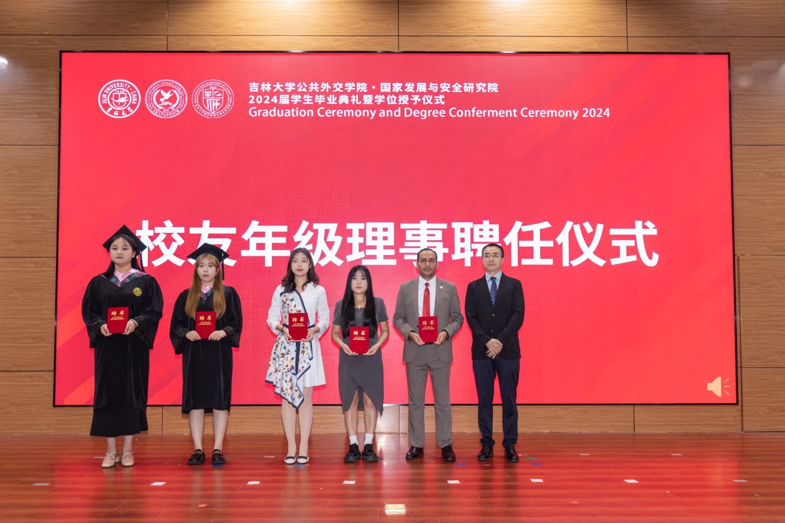 随后,王力宣读了毕业生名单。毕业生们身着学位服依次上台,肖晞和杨民为毕业生们拨动流苏,颁发学位证书。接着,典礼上为优秀毕业生颁发了荣誉证书,并举办了2024届校友年级理事聘任仪式,于洪生为受聘理事颁发证书。