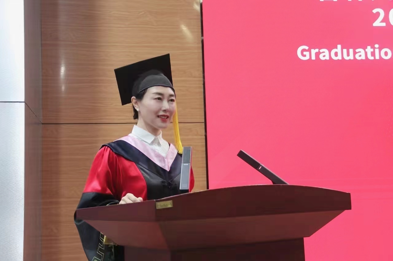 最后,要以“体验”为舵,感悟自我、行稳致远。肖晞引用英国社会思想家安东尼·吉登斯著作中的语句和电视剧《我的阿勒泰》中的情节,寄语全体毕业生“人生是旷野,不是轨道。”她指出,走进社会,同学们会面临比选课更复杂的选择,比“是考研还是工作”更难做出的决定,她衷心祝愿同学们走出的每一步都坚实有力,每一程都不虚此行,勉励同学们要以世界眼光丈量寰宇,坚守家国情怀初心不移,在青春的田野上砥砺耕耘,收获有意义、有价值的人生。在各位毕业生即将开启新的人生征程之际,肖晞诚挚祝愿同学们毕业快乐、前程似锦、逐光而行、一路生花,并欢迎大家常回家看看,共同守护美好的青春回忆。