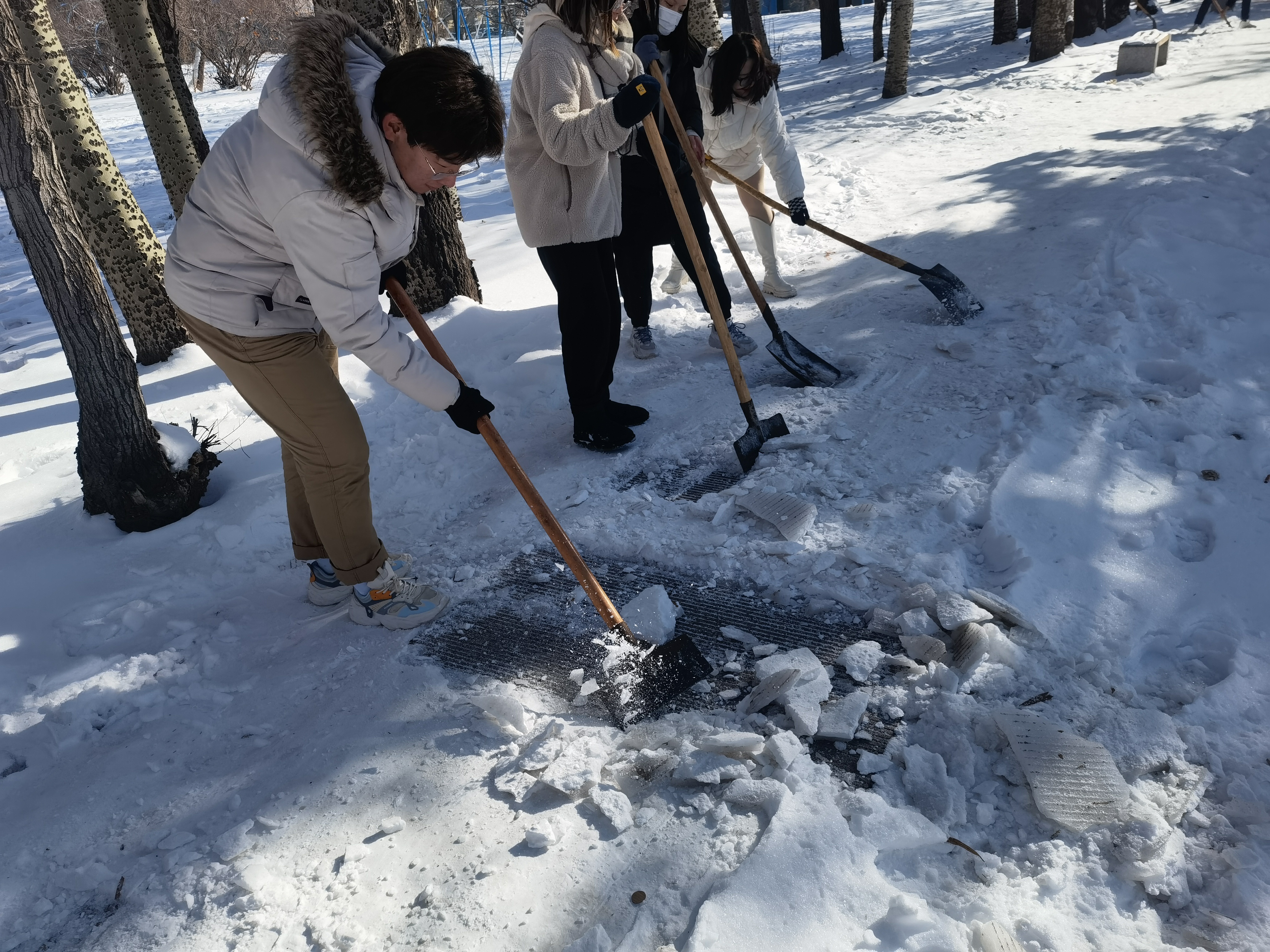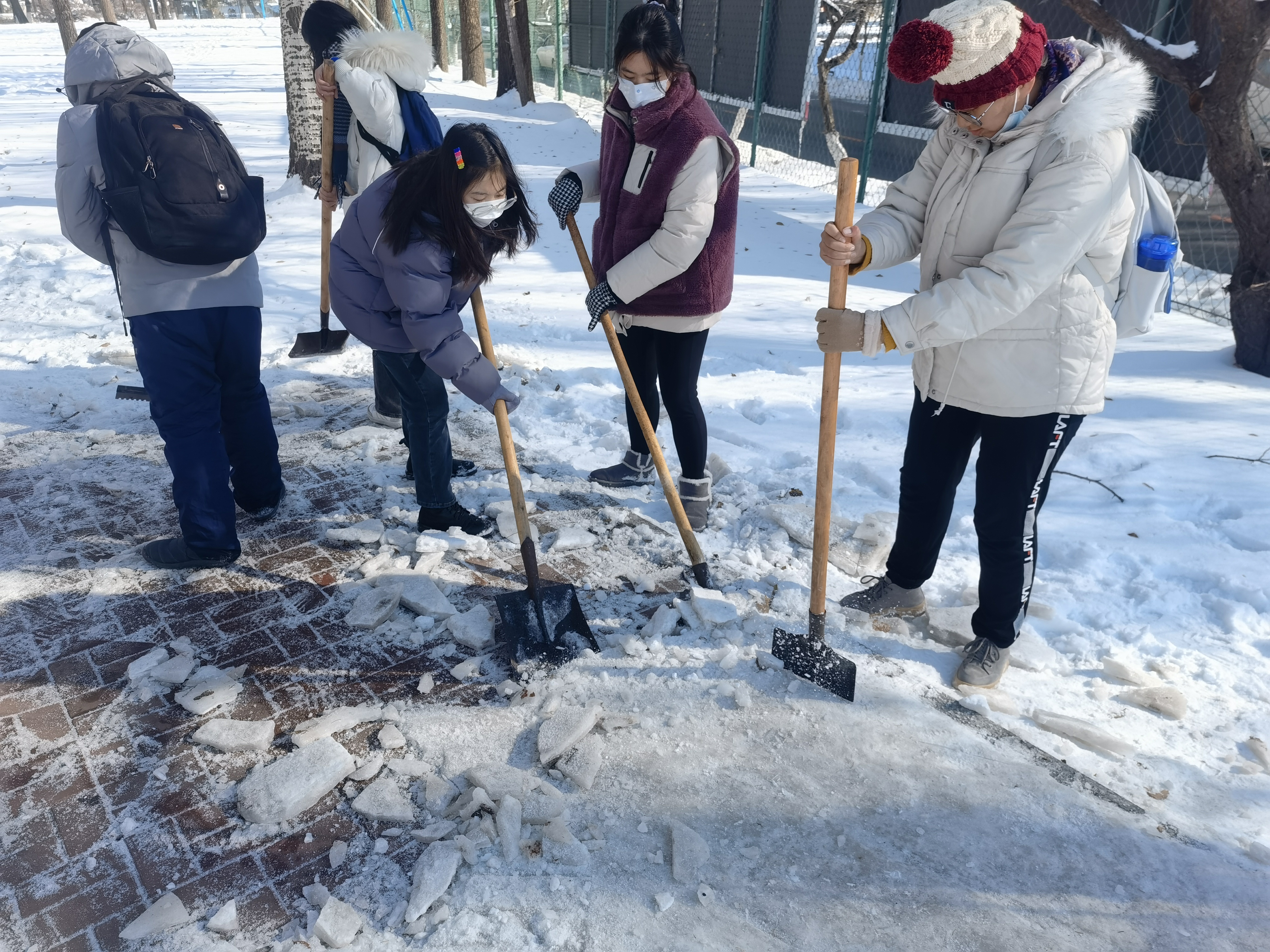 的组织安排下,三十多名入党积极分子带上铲雪的工具,一齐来到了篮球场旁的小路上,很快地投入了热火朝天的劳动中。路面结冰较厚,较难铲动,女生们力气较小,便负责松动冰面以及将冰块运到路边,而男生们力气较大,便负责将冰铲起。大家分工明确、紧密配合,氛围其乐融融,工作紧锣密鼓地进行地同时又充满了欢声笑语。天气很冷,但是同学们除雪的热情不减,充分地展现了学子的昂扬向上的精神面貌和不辞辛苦服务他人的品格。经过一个多小时的辛苦铲雪工作后,将负责的区域的积雪进行清扫,为行人开辟出了一条安全的道路,扫雪任务基本完成,消除了因大雪天气导致的安全隐患,为师生的安全出行提供了方便