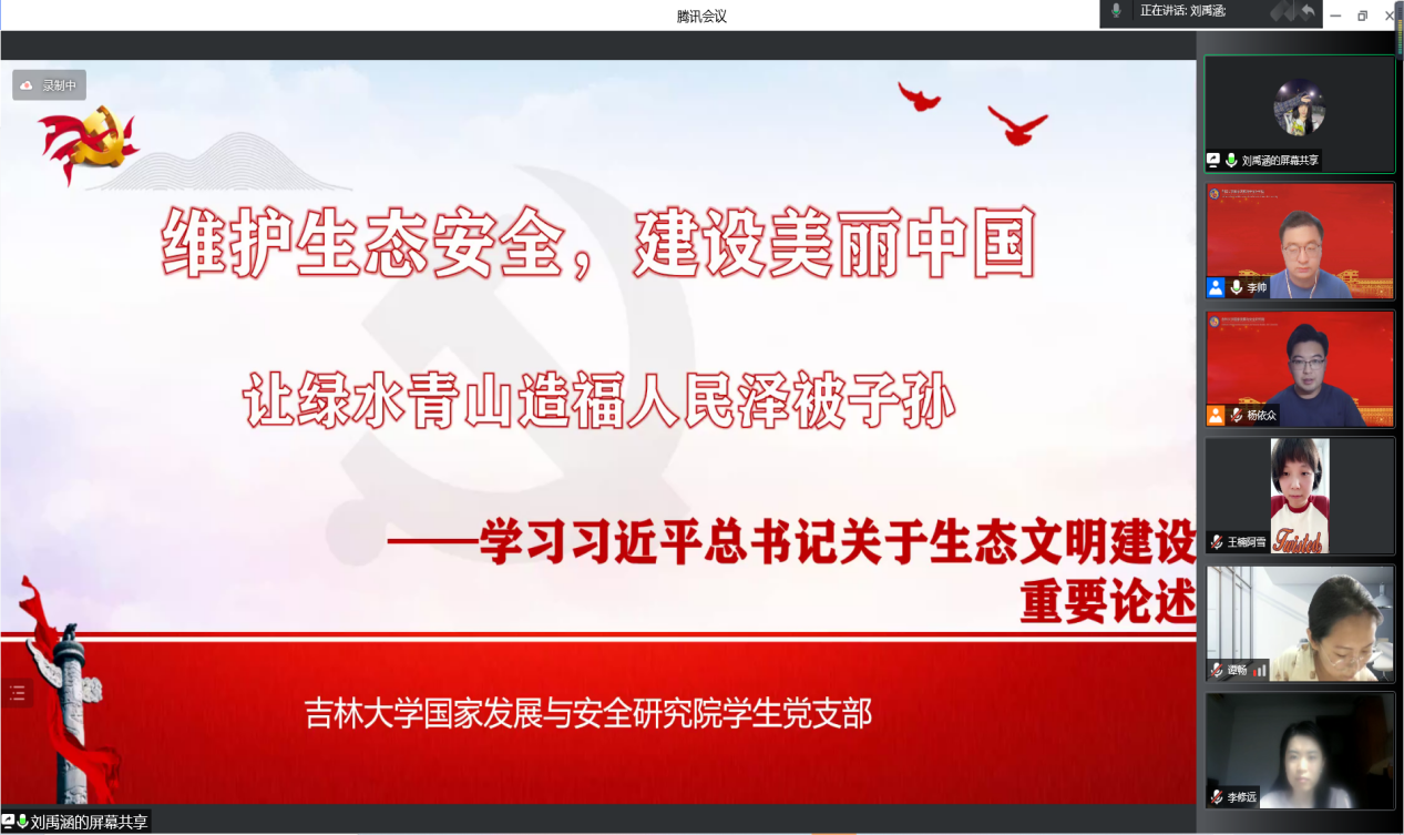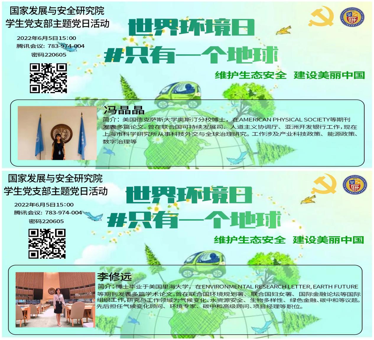 6月5日,国家发展与安全研究院学生党支部以“维护生态安全,建设美丽中国”为题召开线上主题党日活动。此次活动特别邀请原国际金融论坛环境专家、联合国环境规划署、妇女署顾问李修远博士和上海市科学学研究所研究员、原联合国可持续发展司职员冯晶晶博士后参会分享,香蕉视频