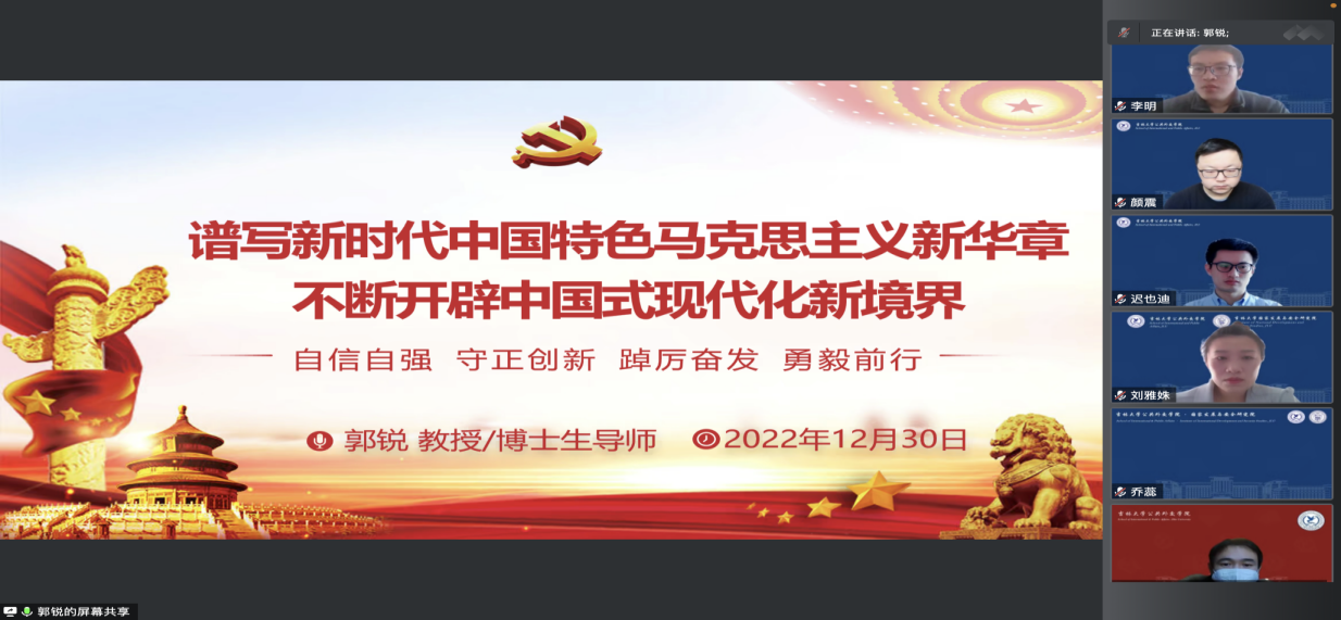 本次报告主题为“谱写新时代中国特色马克思主义新华章 不断开辟中国式现代化新境界”。郭锐教授表示,党的二十大报告,字字催人奋进,句句激荡人心,给人以信仰的感召、方向的指引和奋进的力量。报告分析了当前国际国内形势,回顾总结了过去五年的工作和新时代十年的伟大变革,阐述了开辟马克思主义中国化时代化新境界、中国式现代化的中国特色和本质要求等重大问题,描绘了全面建成社会主义现代化强国的宏伟蓝图和实现路径,为我国新时代发展开启了新的篇章。