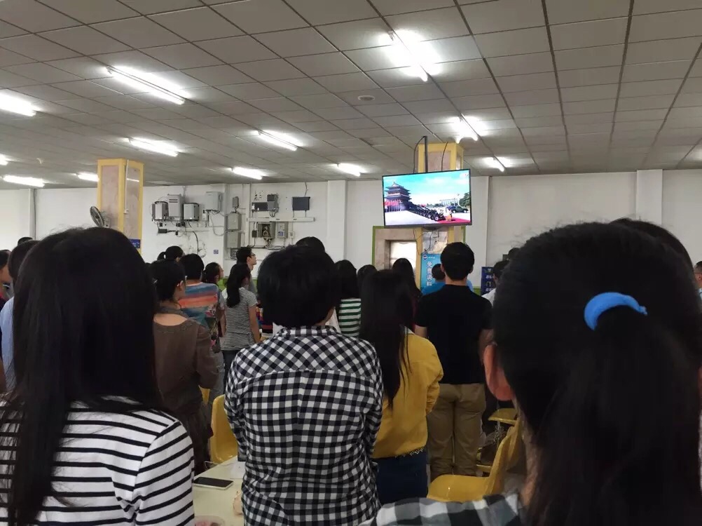 2015级新生在中心校区四食堂集体观看了纪念中国人民抗日战争暨世界反法西斯战争胜利70周年大阅兵电视直播。