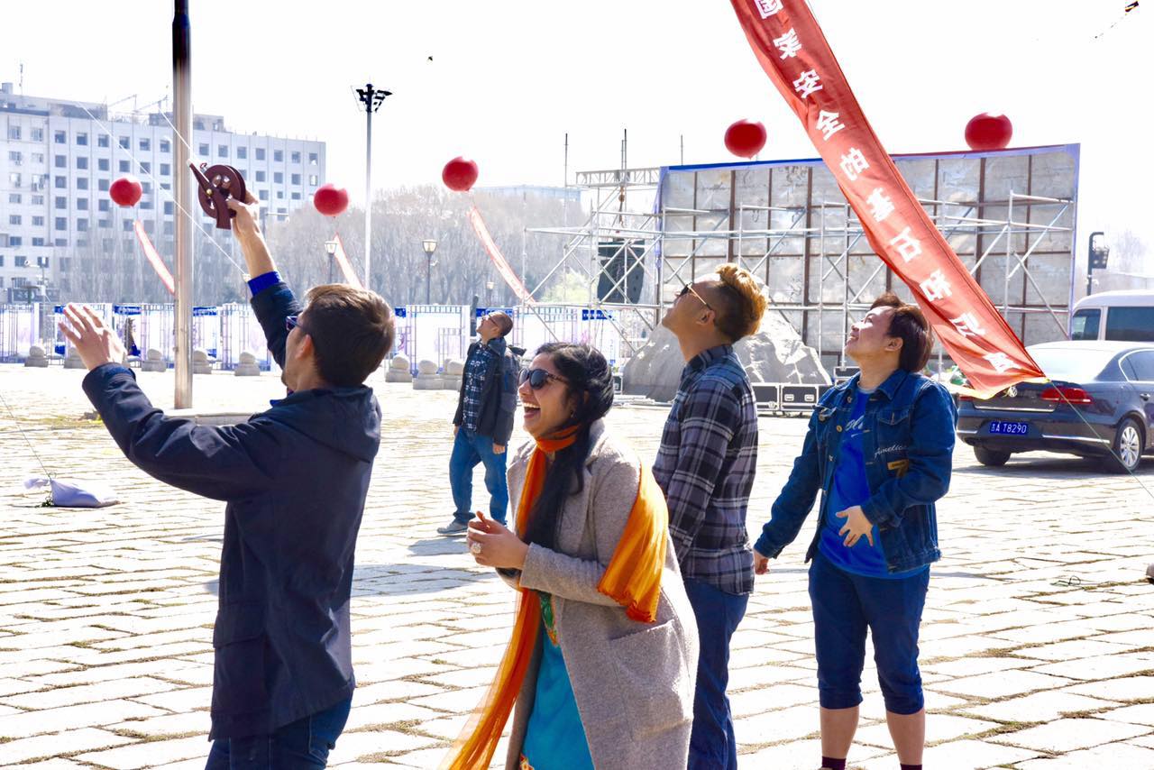 下午,同学们乘车来到了儿童公园。刚一进门,正好遇见了周末前来的秧歌队。大爷大娘们的舞步,欢快的二人转乐曲,深深地感染了同学们。很快,学生自发地加入到了秧歌的队伍中,跟随热情的长春市民们舞动起来,亲切地进行了互动。告别了秧歌队,同学们向游乐场出发,路上活泼的留学生们还不禁手舞足蹈,沉浸其中。到达游乐场后,同学们分别体验了摩天轮、过山车和游船。鸟瞰了万物复苏的春城,放松了身心,欢声笑语不断。