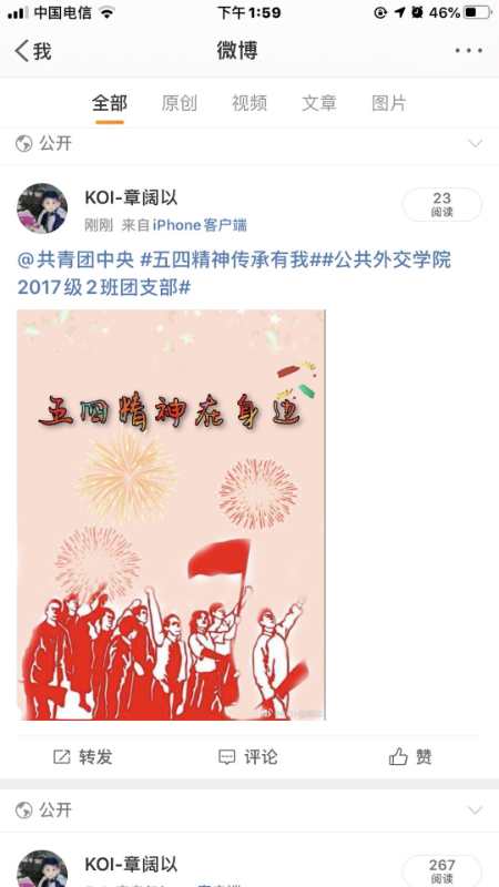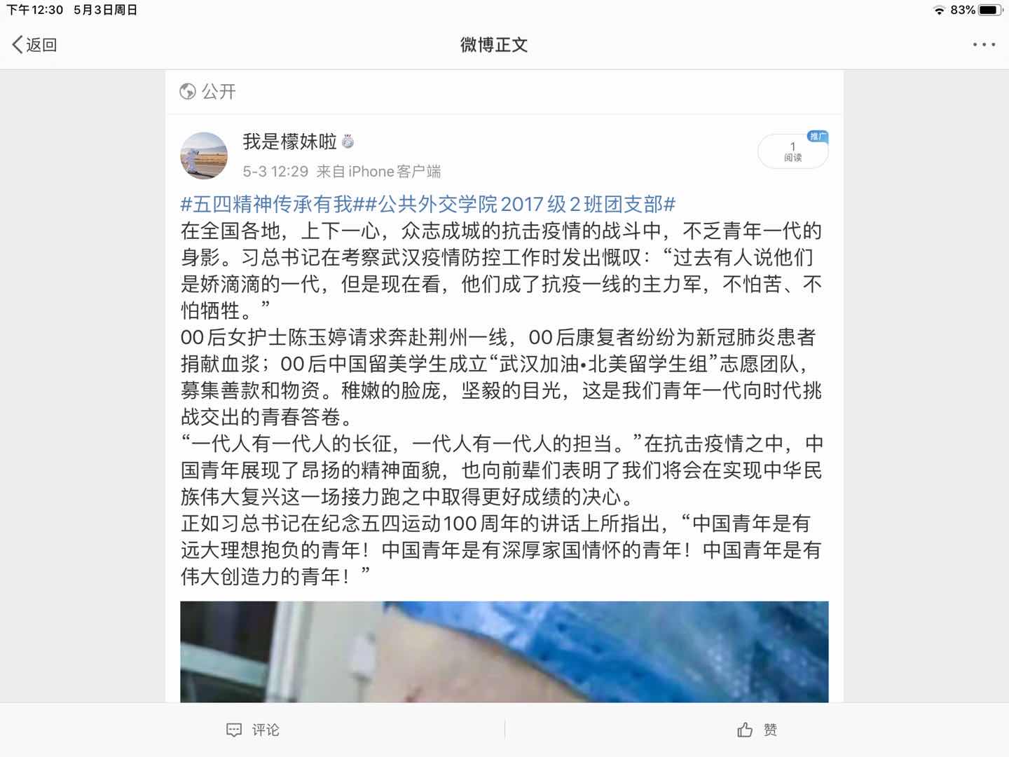 2017级2班团支部组织开展了“五四精神·传承有我”主题团日活动。以“我身边的五四精神”为主题,向同学们征集了疫情期间的所听、所见、所感以及所经历的一切令人感动的事情,以文字、海报以及短视频的形式,在微博平台进行互动宣传。支部同学积极踊跃地参加此次活动,以下是部分优秀宣传作品的展示:
