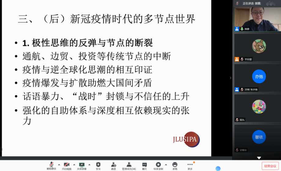 颜震老师从新冠肺炎疫情对人类社会的影响,以及后疫情时代下国际关系的复杂变化等角度出发,引入了本次沙龙对“多节点世界、新冠疫情与公共外交的重构”这一话题的探讨。