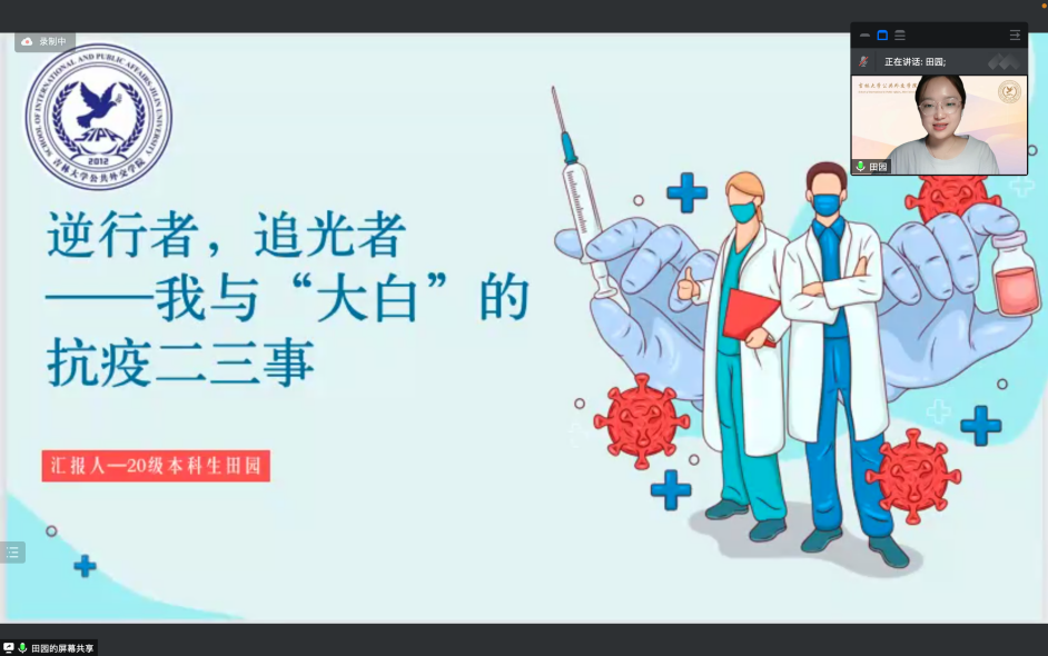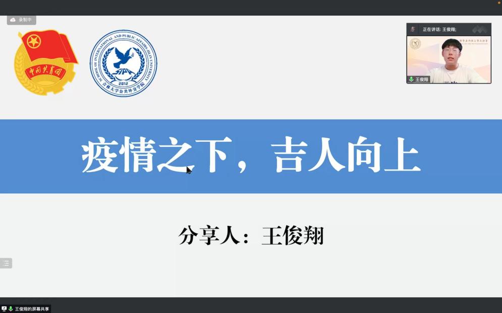 最后,王俊翔同学分享了他的抗疫故事。他说,作为共青团员,参加志愿者服务是他的责任。鲁迅曾言:“我们从古以来,就有埋头苦干的人,有拼命硬干的人,有为民请命的人,有舍身求法的人。”香蕉视频