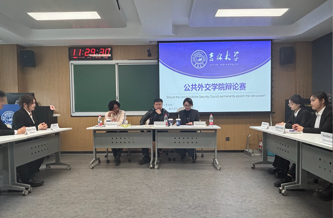 博士留学生担任评委。比赛按照英国议会制辩论规则,41名本科生分为8组,围绕“人工智能是否威胁到人类判断在国际谈判中的作用?”、“大国是否应当就小型模块化核反应堆(SMR)部署问题谈判达成一项具有约束力的国际条约,以防范核扩散风险并确保外交稳定?”、“联合国安理会是否应永久废除常任理事国否决权?”、“联合国是否仍是全球治理的核心支柱?”四个辩论主题展开辩论。四个辩论题目都紧扣事实热点,兼具现实意义与启发价值。