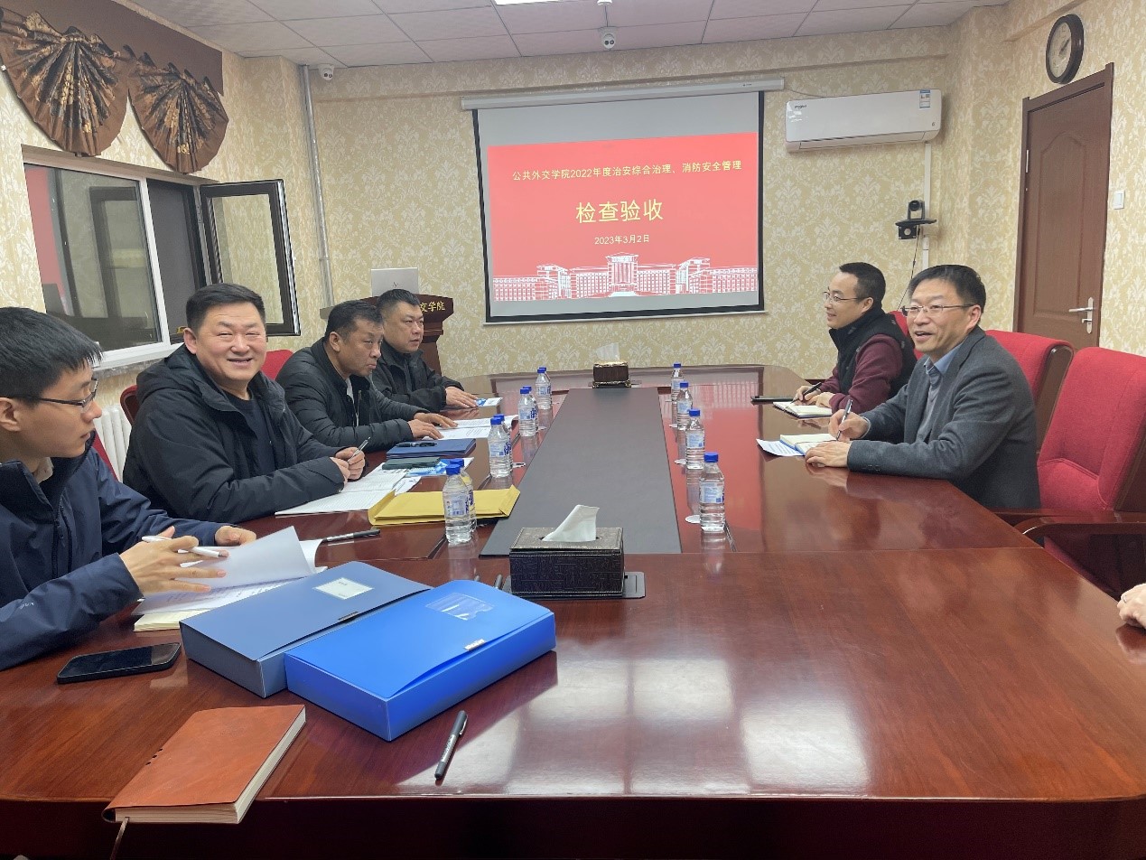 202332日下午,由保卫处副处长周鹏、党委办公室正科级秘书李卿功、保卫处消防科副科长董立明、治安科副科长赵明组成的香蕉视频 2022年度治安综合治理、消防安全管理检查验收工作组到香蕉视频 开展检查验收工作。香蕉视频 党委书记杨民、行政副院长于洪生、院办主任沈毅、工作人员苏文杰等参加检查验收会议。