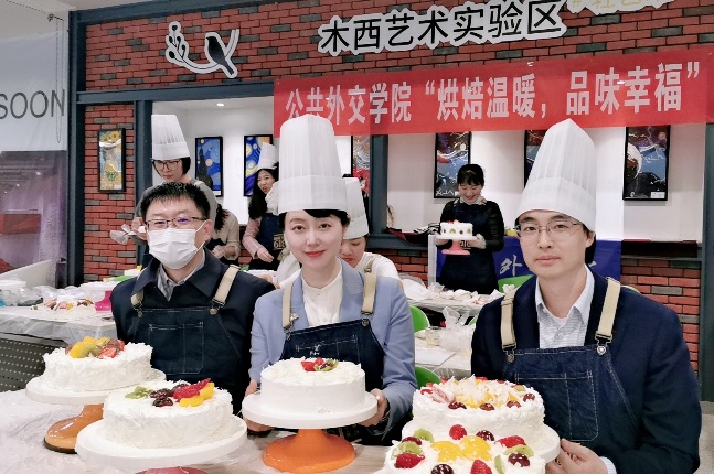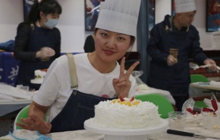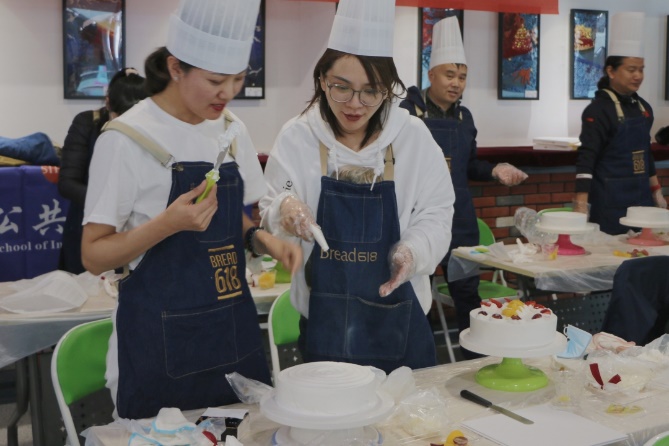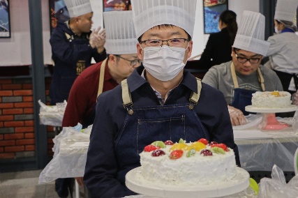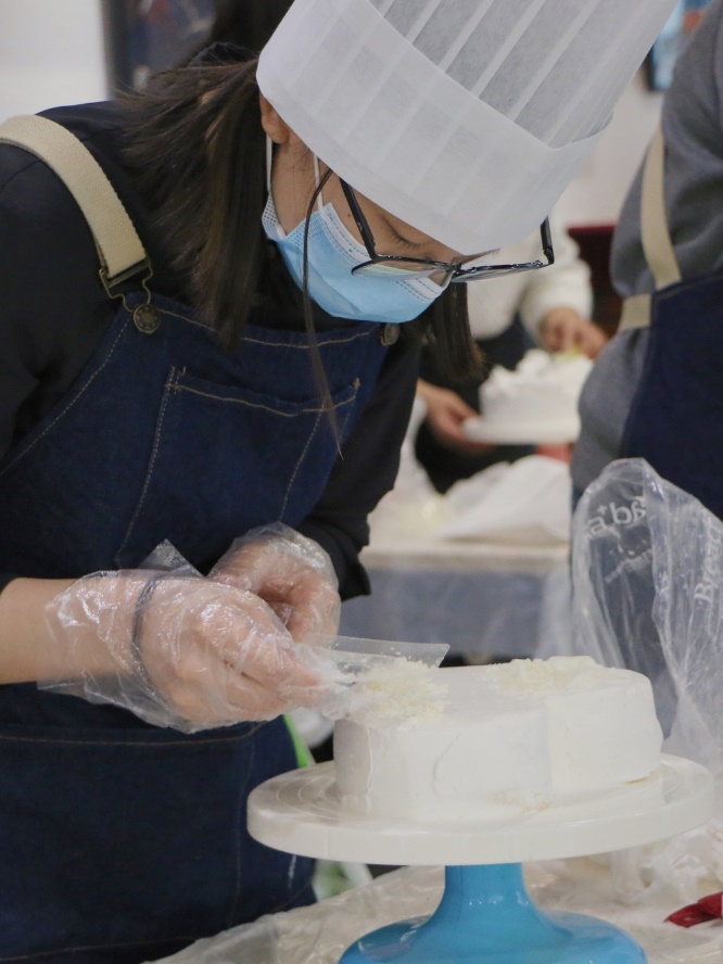 近20名教职工穿上围裙,带上厨帽,一同学习制作了蛋糕。