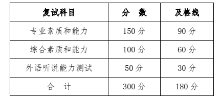1.复试成绩满分300分(最后折合成100分),保留小数点后两位。复试中总分、专业素质和能力、综合素质和能力、外语听说能力测试任一项未达到及格线的考生不予录取。