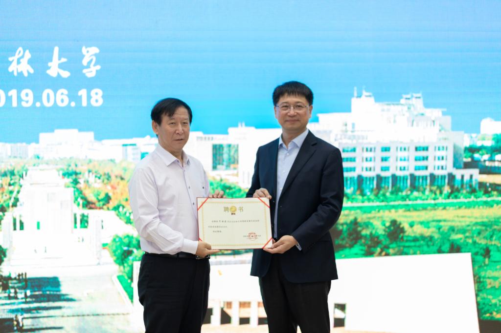 国家发展与安全研究院揭牌。张希为研究院咨询委员会主任于洪君发放聘书。