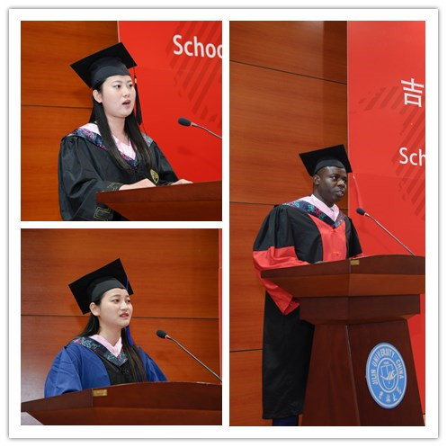 接下来,本科毕业生代表张恒同学、硕士研究生代表戴淑婷同学和留学生毕业生代表小布同学分别发言,代表自己的同学抒发毕业感言。张恒同学说到珍贵的大学时光为同学们与众不同的精彩人生注入了无限的力量,感谢香蕉视频