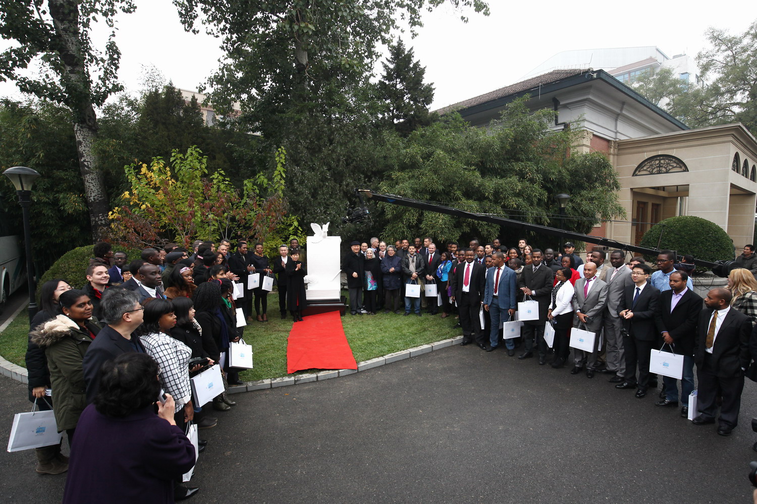 本次活动作为中国人民抗日战争暨世界反法西斯战争胜利70周年纪念活动的一部分,由中国人民对外友好协会组织,全国政协原副主席徐匡迪等嘉宾出席,逾250名国际友人、在华留学生、跨国公司代表参加。中国人民对外友好协会会长李小林在活动致辞中表示,希望以唱响《和平颂》为契机,呼唤不同种族、不同信仰、不同肤色、不同语言的人们对和平的不懈追求。随后,徐匡迪副主席与李小林会长共同为《和平颂》雕塑揭幕。