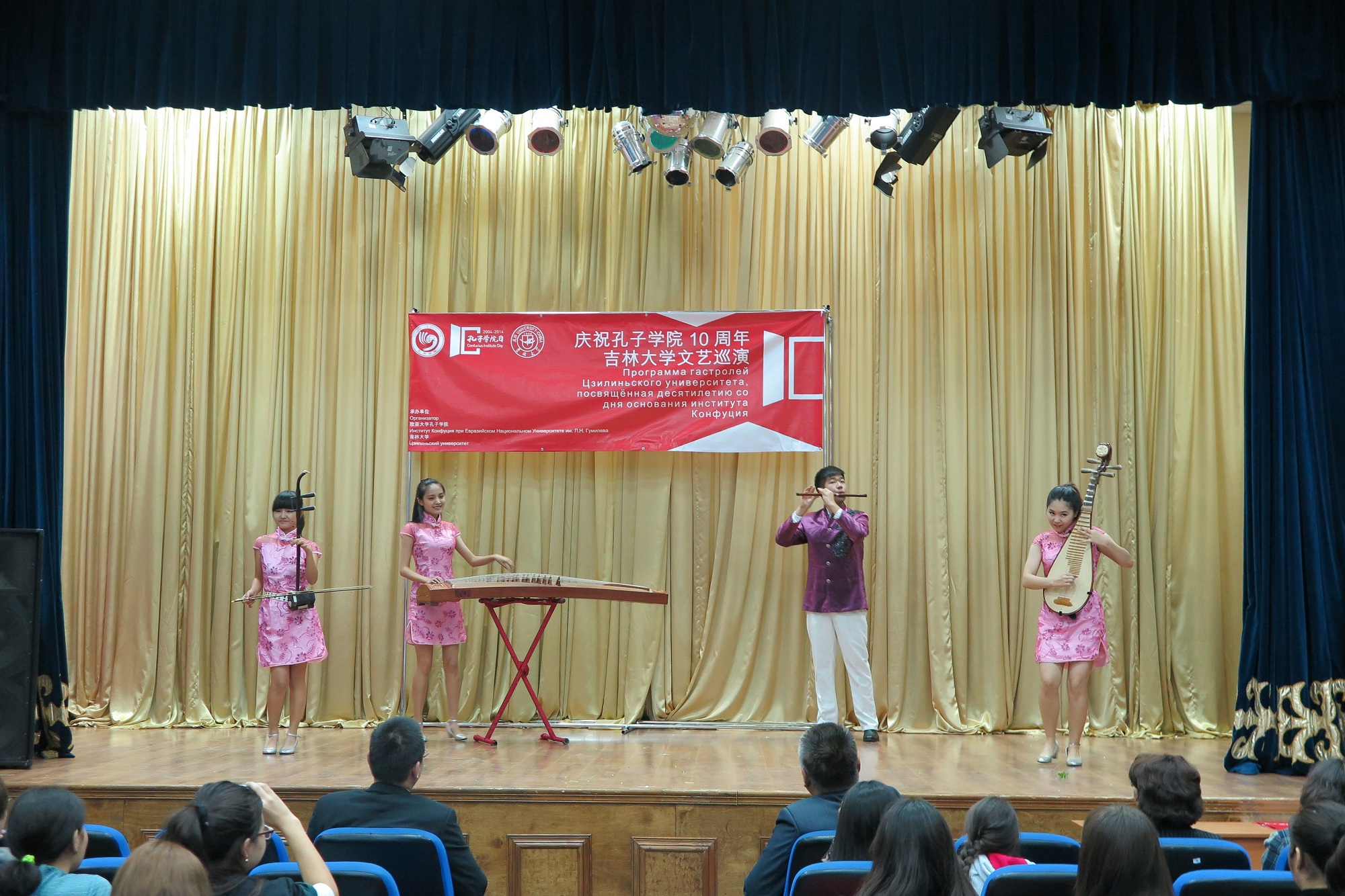 进行演出。演出在新民族音乐《茉莉花》中拉开了序幕,中国传统乐器弹拨出的优美的旋律展现了中华民族音乐的独特韵味。秧歌舞《东北印象》动作明快,节奏欢乐,地域特色鲜明,展现了东北人民乐观开朗的民风,赢得了观众的阵阵掌声。游戏节目更是笑声连连,观众积极踊跃互动。演出取得圆满成功。中国驻哈萨克斯坦大使馆柳燕老师出席并观看了首场演出,并在演出后与演员们合影留念。