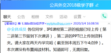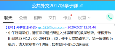 在线教学过程中,老师们进行了大胆的探索和尝试。陈曦老师在其《国际公共关系学》课程中结合课程的具体特征,将微课视频和直播教学结合起来,在学生视频学习之外隔周进行一次直播讨论互动课。乔蕊老师对学生进行了在线问卷调查,了解学生对课程的建议以及希望老师提供哪些方面的学习帮助,同时也以作业方式保证教学质量。崔悦老师采用每两周布置一次在线作业的方式,旨在通过批阅作业发掘学生对于知识点理解的偏差与难点,通过QQ与相关学生进行线下答疑。邹晓龙老师结合钉钉平台在直播方面所具有的流畅、功能完善等优势采用直播教学形式授课,授课过程中与学生上麦互动,直播后布置课后阅读任务与作业,并在下次课程进行作业点评,实时检验学生的学习效果。孙丽萍老师基于已经建设完成的国家精品在线课程资源并结合上传PPT和推荐书目到教学平台进行教学。