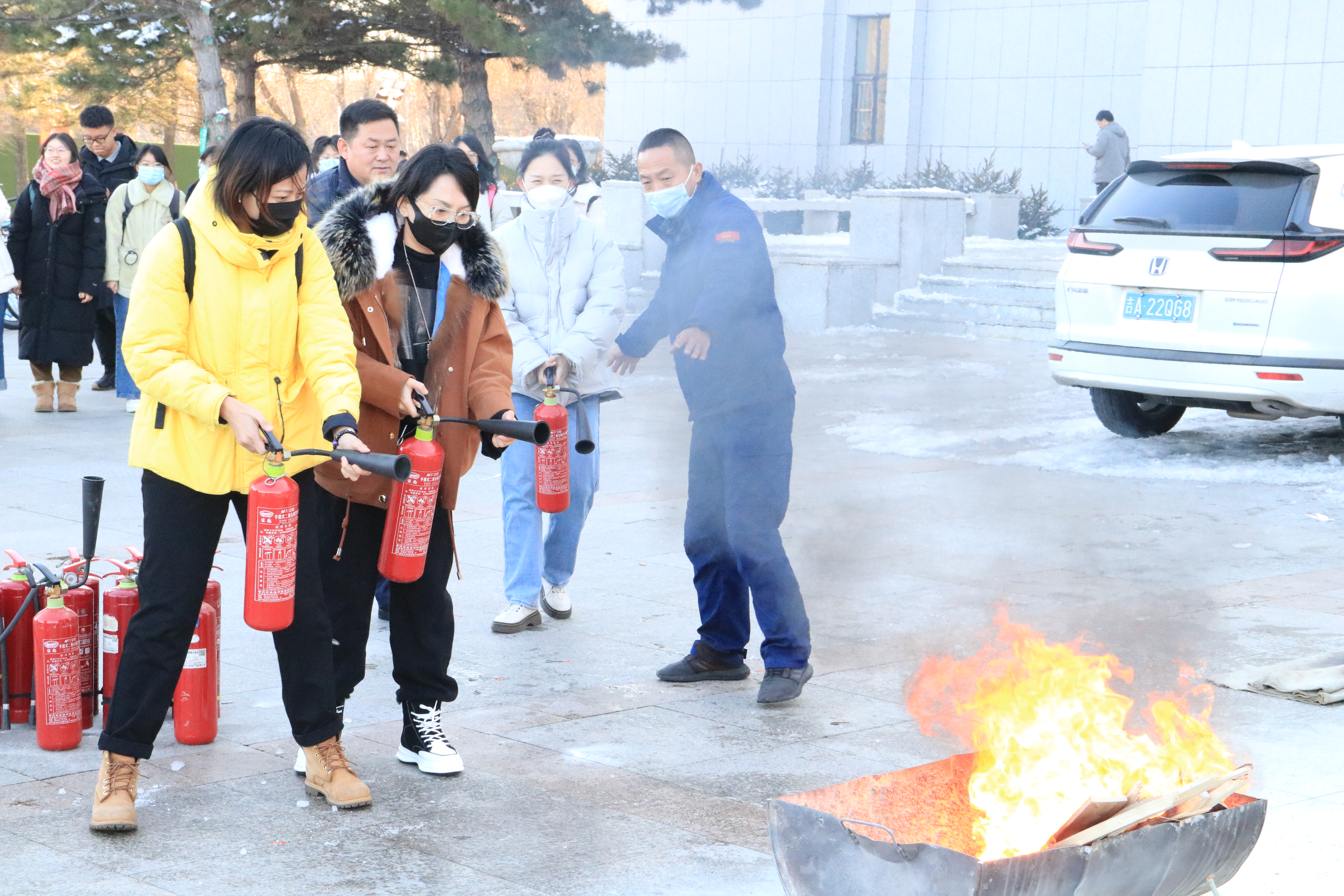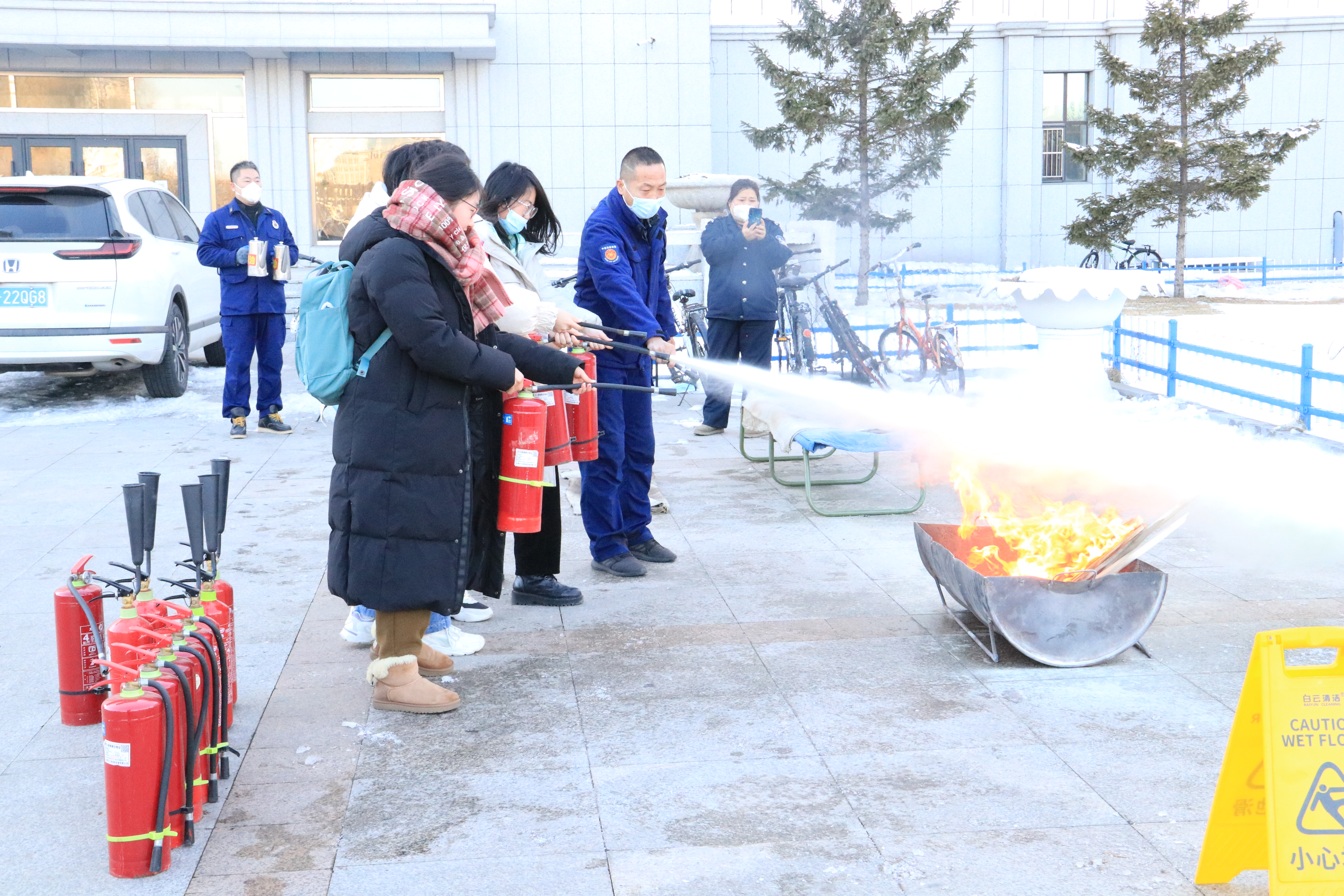 随后,在保卫处消防科消防演练团队的精心准备下,同学们参加了消防安全演练。在吕振羽楼前,工作人员就灭火器和灭火毯的使用及操作中应注意的问题做了详细的说明演示,并现场指导部分师生进行灭火实操演练。演练中,师生们态度认真、密切配合,在实操中增长了消防安全知识,掌握了自救能力,演练达到预期效果。