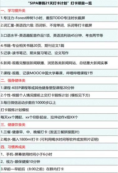 学生会组织“寒假二十一天打卡”活动,鼓励学生从高效学习、强身健体、健康饮食、习惯养成四个方面自我提升,以激励措施及共同监督机制推进学生学习自主化、积极化、健康化。
