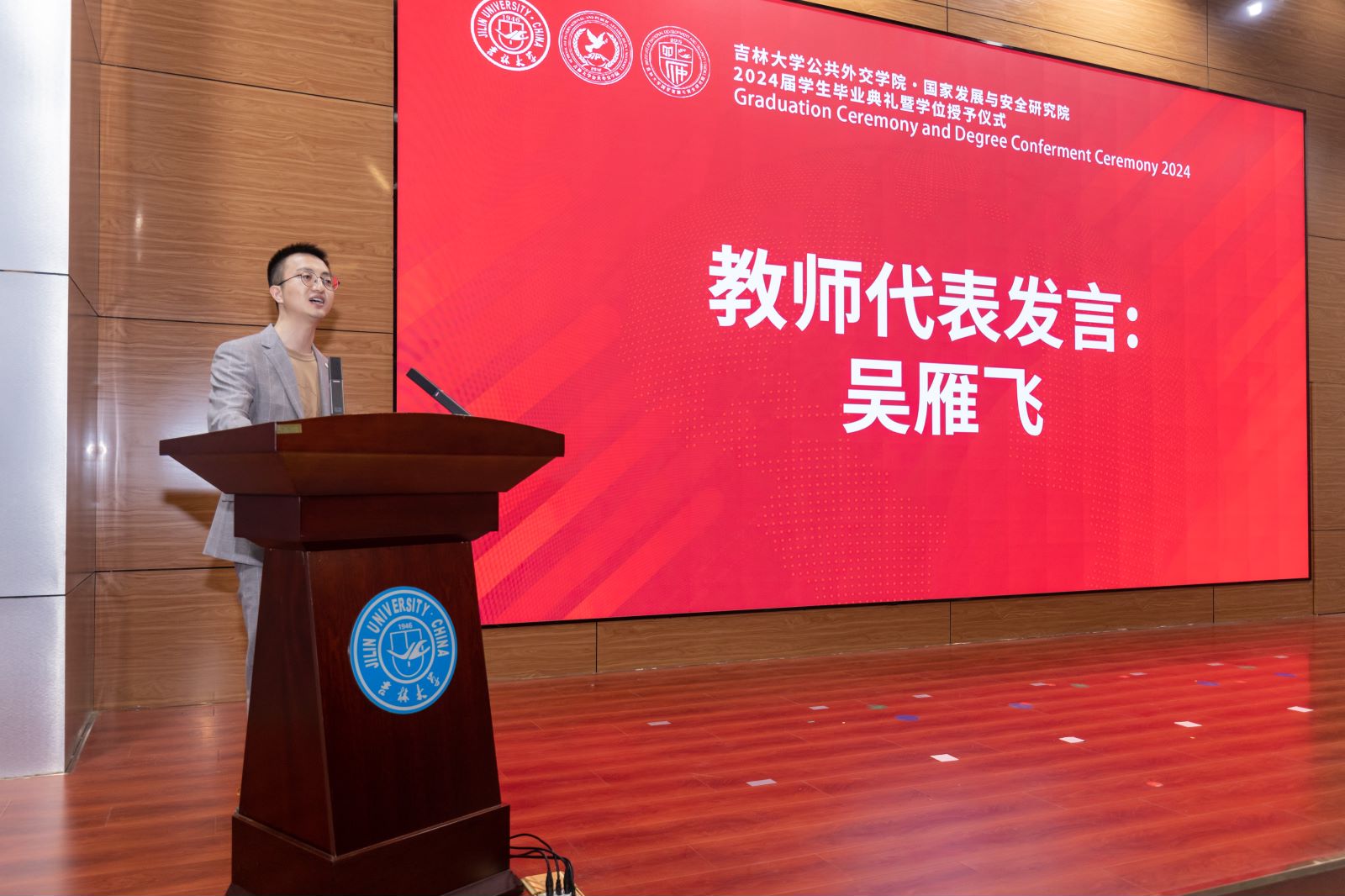 老师和同学们的一路陪伴表达了诚挚的感谢与崇高的敬意,并与全体毕业生共勉,希望大家始终以追求真理为目标,求新、求精、求进,不断向真知的高峰攀登;希望大家无论坚守在何种岗位之上,始终葆有理解、尊重、宽容与合作的优秀品质,热爱祖国和人民;希望大家在未来的人生道路上,始终以勇气为帆,带着求学路上的所学、所见和所得勇毅前行,不畏艰险,踔厉奋发。