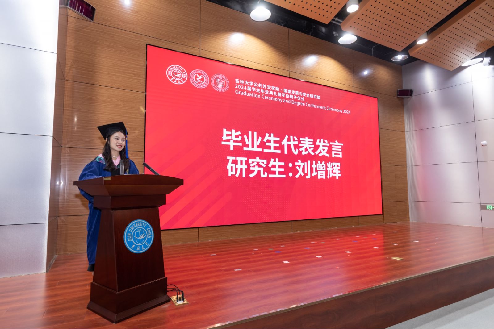 毕业生代表发言环节中,本科毕业生代表田园同学回忆了自身大学四年间的成长历程,向给予同学们谆谆教诲的老师们与朝夕与共、团结友爱的同学们致以衷心的感谢与美好的祝福,她呼吁同学们在新的人生旅程中须秉初心、知难上,戒骄狂,常自省,在新的时代洪流中持续学习,永葆青春风采。