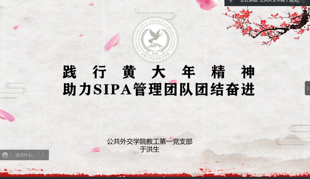 负责联系党支部的副院长于洪生以“践行黄大年精神,助力SIPA管理团队团结奋进”为题,为支部全体党员讲授了专题党课。他首先带领全体党员同志回顾了黄大年教授的生平,重温了习近平总书记对黄大年同志先进事迹作出的重要指示,理解“什么是黄大年精神”的同时,以“真切和真实,理解和践行,力行和传承,育人和感恩”为关键词,谈了自己对黄大年精神学习的心得体会。