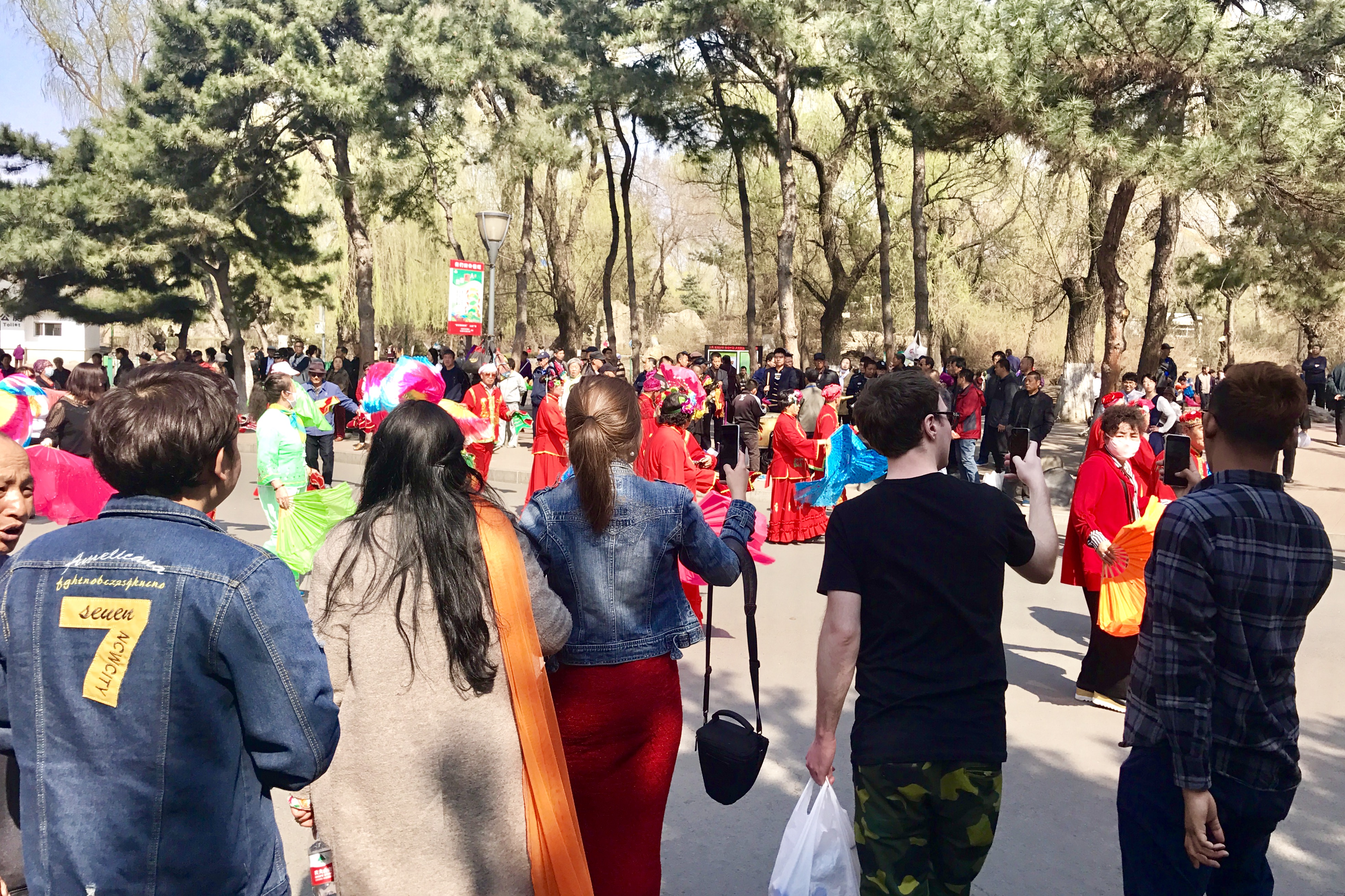 下午,同学们乘车来到了儿童公园。刚一进门,正好遇见了周末前来的秧歌队。大爷大娘们的舞步,欢快的二人转乐曲,深深地感染了同学们。很快,学生自发地加入到了秧歌的队伍中,跟随热情的长春市民们舞动起来,亲切地进行了互动。告别了秧歌队,同学们向游乐场出发,路上活泼的留学生们还不禁手舞足蹈,沉浸其中。到达游乐场后,同学们分别体验了摩天轮、过山车和游船。鸟瞰了万物复苏的春城,放松了身心,欢声笑语不断。