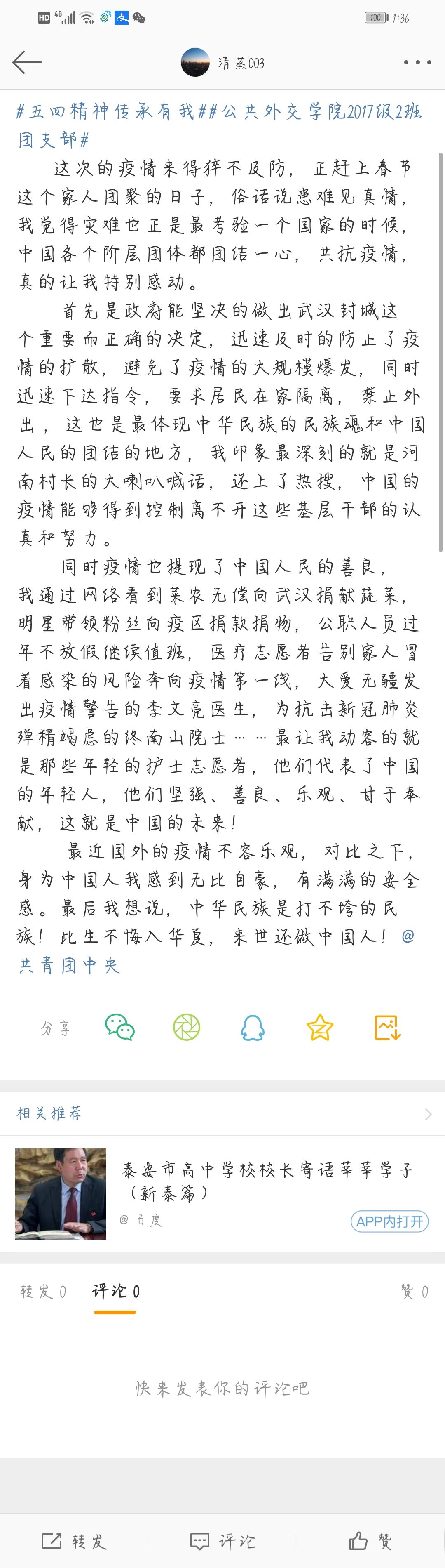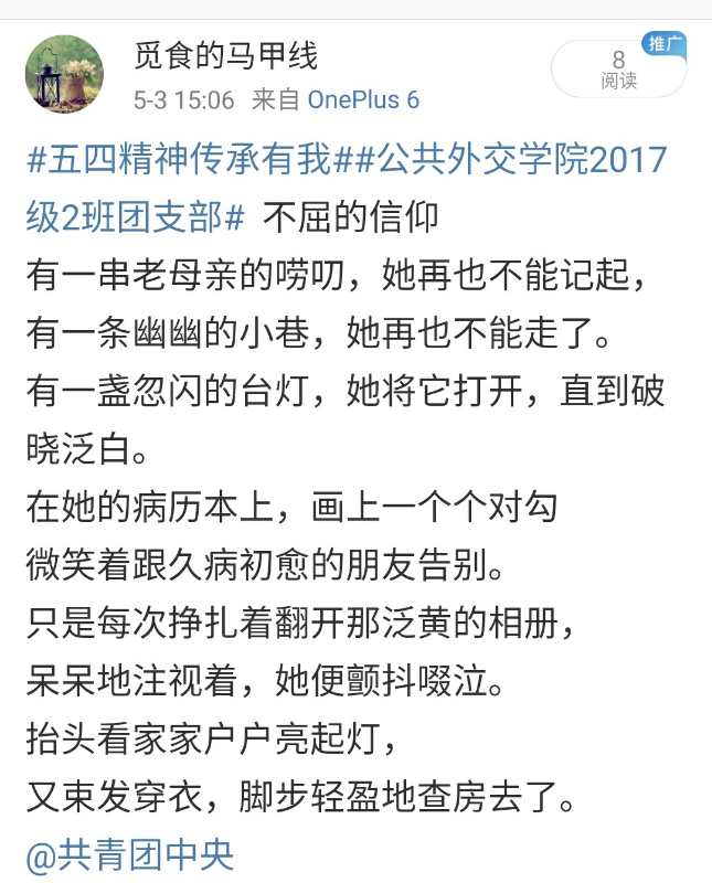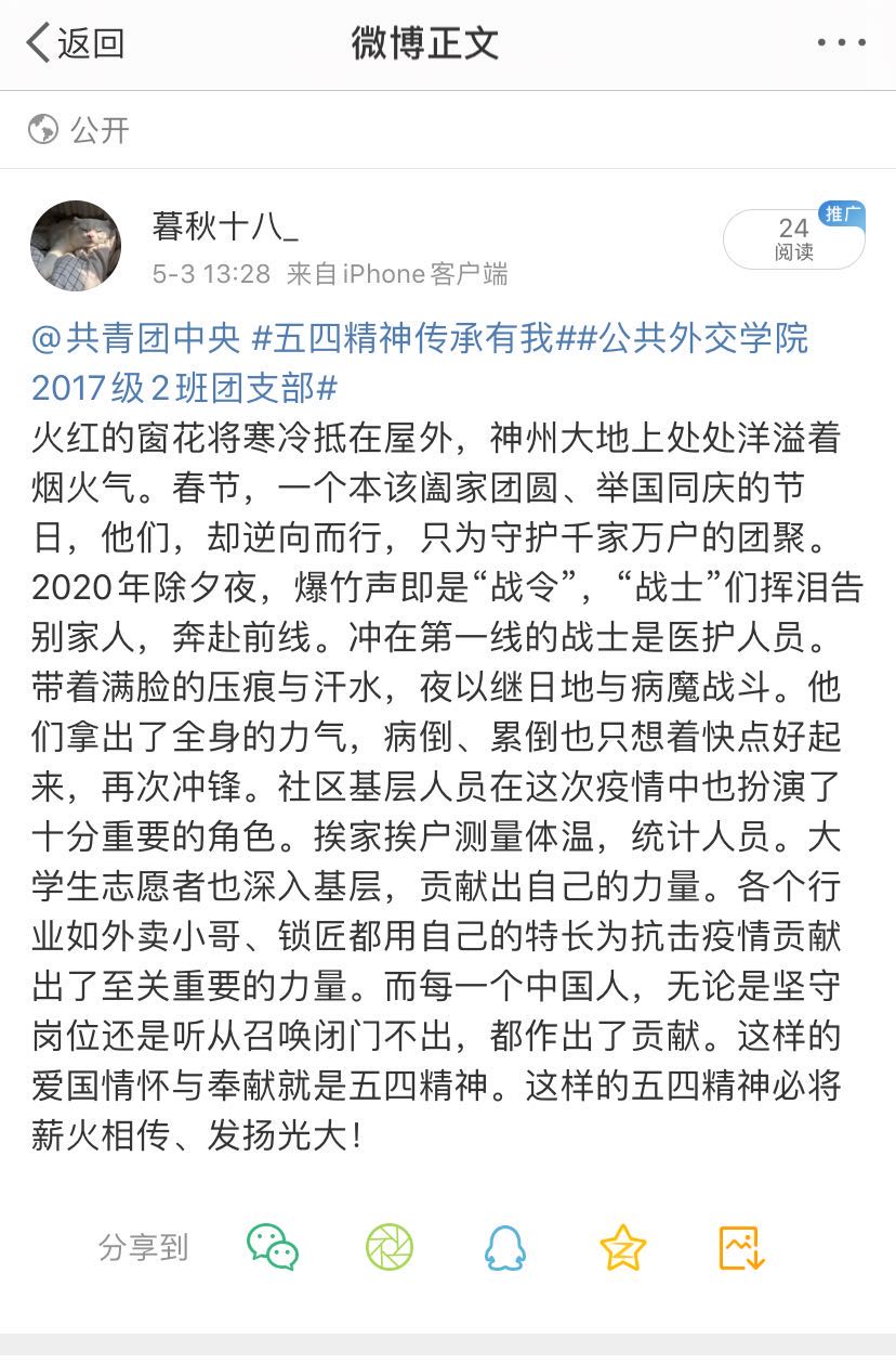 2017级2班团支部组织开展了“五四精神·传承有我”主题团日活动。以“我身边的五四精神”为主题,向同学们征集了疫情期间的所听、所见、所感以及所经历的一切令人感动的事情,以文字、海报以及短视频的形式,在微博平台进行互动宣传。支部同学积极踊跃地参加此次活动,以下是部分优秀宣传作品的展示: