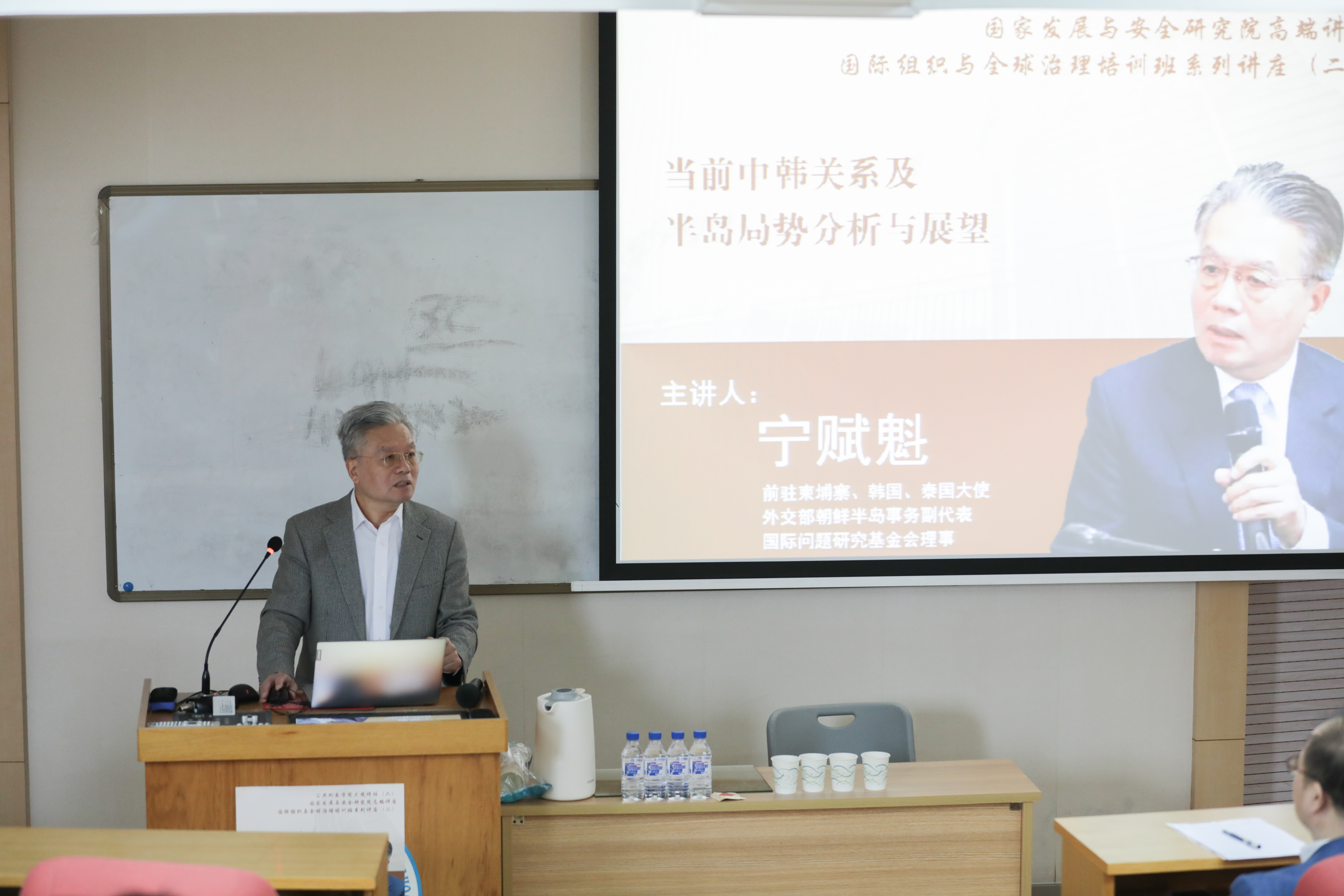 4月25日上午,前驻柬埔寨、韩国、泰国大使,外交部朝鲜半岛事务副代表,国际问题研究基金会理事宁赋魁大使作题为《当前中韩关系及半岛局势分析与展望》专题讲座。讲座由国家发展与安全研究院副院长郭锐教授主持,香蕉视频