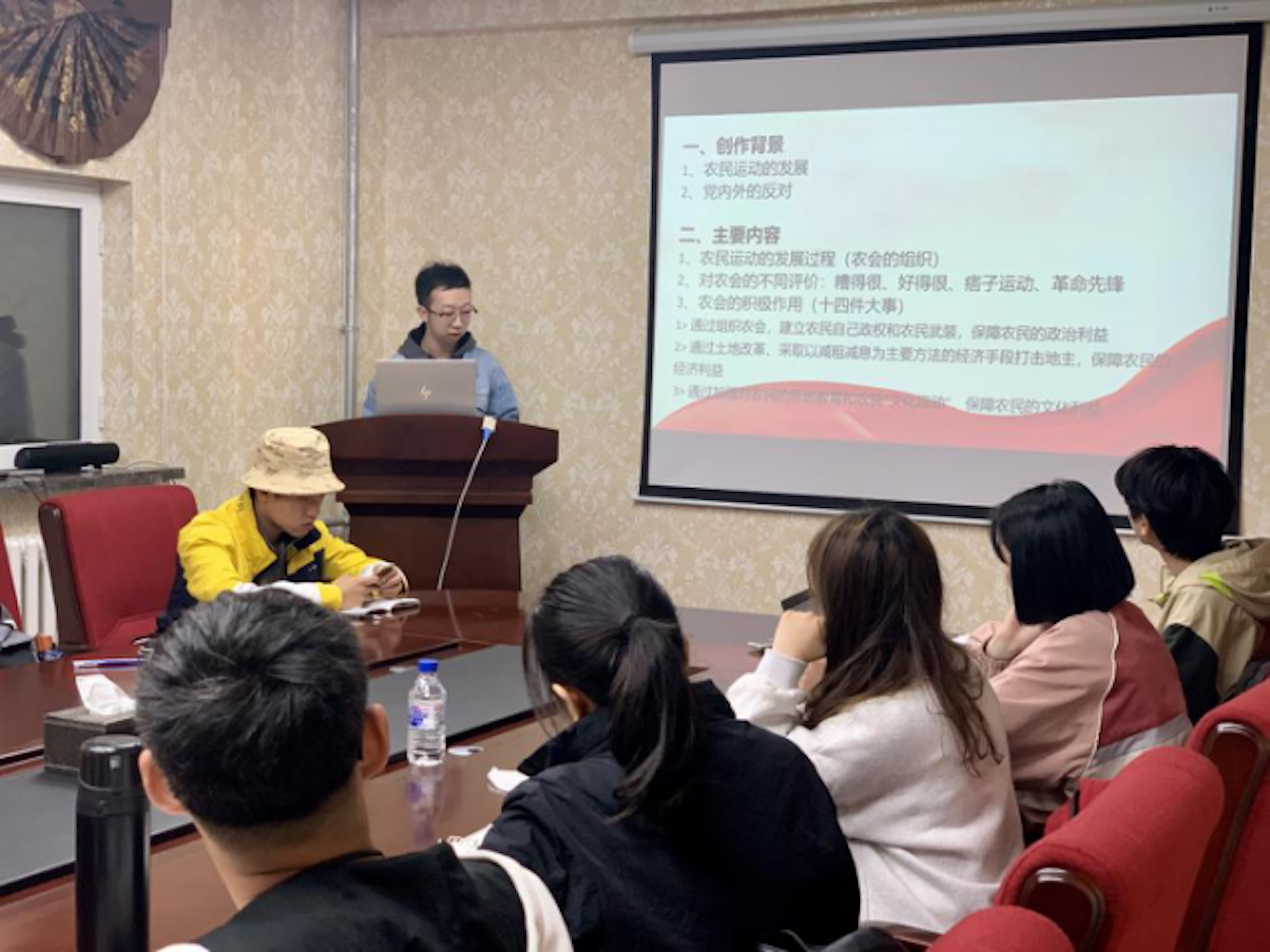 学生党支部崔宇同学结合本次社会实践活动的主题,从创作背景、主要内容、现实意义等三个维度入手,带领实践团成员共同学习了毛泽东主席的《湖南农民运动考察报告》。会议最后,团队领队王家辉同学对本次社会实践活动的整体行程安排和具体人员分工进行了详细说明,鼓励团队成员密切配合、圆满完成本次社会实践活动。