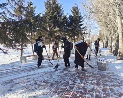 零下二十多度的体感温度和凌冽的寒风并没有让同学们抱怨,大家不怕辛苦、不畏严寒,为校园里的行人出行提供了便利安全的环境。