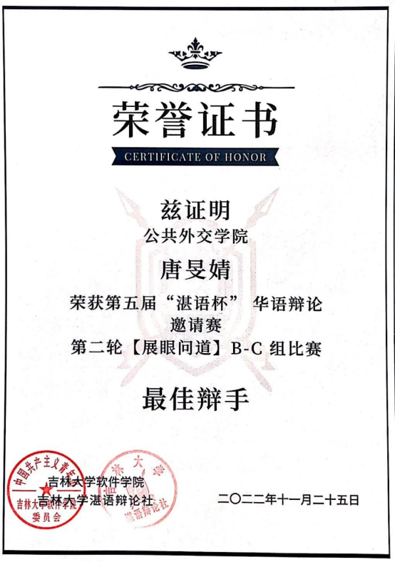 辩论队组成的联队也表现出色,其中唐旻婧同学表现优秀,获得了单场最佳辩手的荣誉称号。