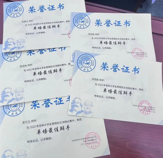 辩论队成员的共同努力。在友思备赛过程中,我们每个人都将课余时间利用到了极致,我们珍惜在一起进行思维碰撞的每一分每一秒,共同立论、改论,坚定自己的持方。作为一辩,我的任务主要是进行一辩稿的整理,为大家提供资料支持,这就需要我在讨论过程中认真聆听并及时记录大家的观点,在此过程中,辩论队成员出的模辩以及学长学姐的指导给予了我丰富的学习参考资料,使我实现了由一开始只会写地板论到以一辩的身份拿到佳辩的跨越式成长。在今后的过程中,我会继续精进自己的辩论技术,争取更好地进步。