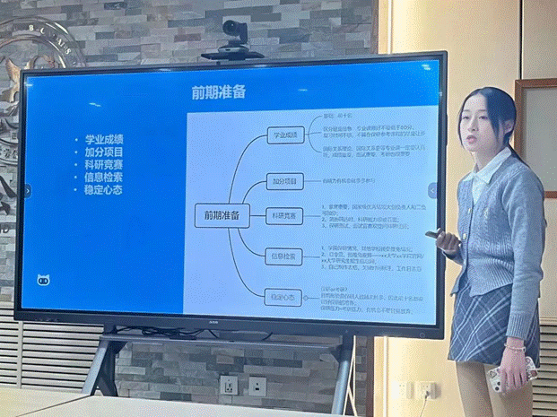宣佳莹同学向大家分享了自己的保研体验和心得体会。她从“自身基本情况”、“材料准备”、“复习准备”与“面试经历和预推免名额”四个方面进行介绍。她强调,成绩排名与英语成绩尤为重要,鼓励大家以学习成绩为主要抓手,同时注重英语能力的提升。随后,她就自身复习材料准备与面试经历进行了分享,详细介绍了不同院校的面试特点。最后,她鼓励同学们勤练英语口语,锻炼应变能力,以良好心态迎接挑战。