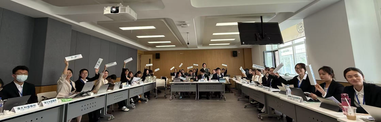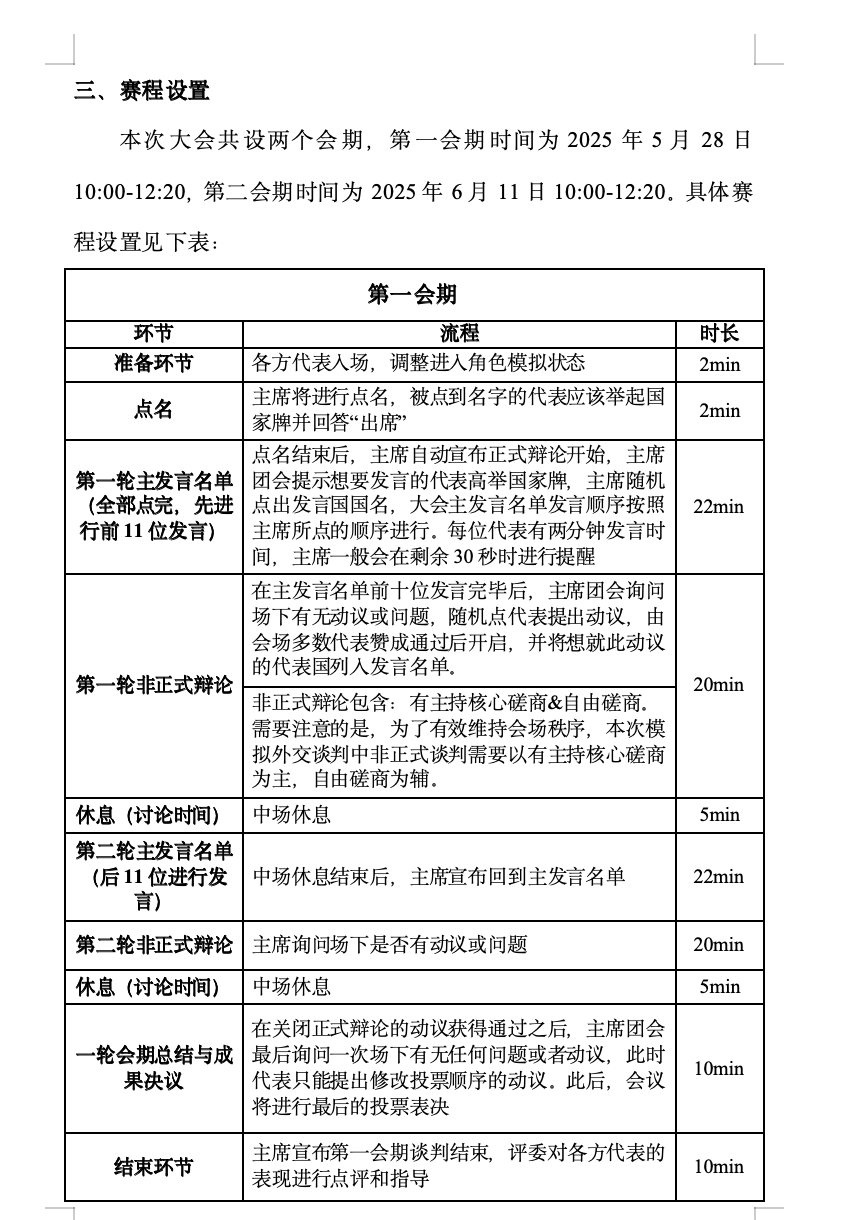 本次模拟外交谈判比赛由两个会期构成,第一会期于2025年5月28日在逸夫楼509举办,邀请邹晓龙、李梦龙、安宁、陈曦四位教师担任评委。第二会期于6月11日在吕振羽楼818会议室举行,邀请邹晓龙、王文奇、崔悦、庄宇航四位教师担任评委。本次模拟外交谈判赛形式为多方谈判模拟,共设22个席位(其中双代表席位19席,单代表席位3席。双代表席位中每个代表享有一票表决权,而单代表席位中每个代表享有两票表决权)。本次比赛议题设置贴近时事,聚焦现实,紧扣全球气候变化与环境治理的关键议题。