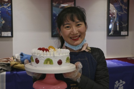 经过一小时左右的精心雕琢,蛋糕从一个个素坯变成了一件件精美的作品:爱心、五角星、水果塔……这些作品各具特色,充满艺术气息。